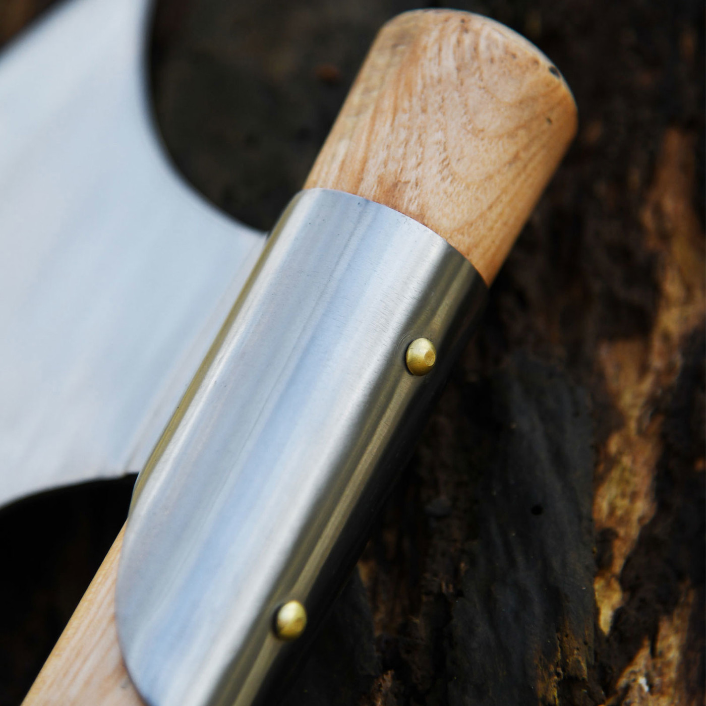 Der fein geschliffene Stahlkopf sitzt fest auf einem robusten Eschenholzschaft, dessen natürliche Maserung den rustikalen Charakter des Stücks betont.
