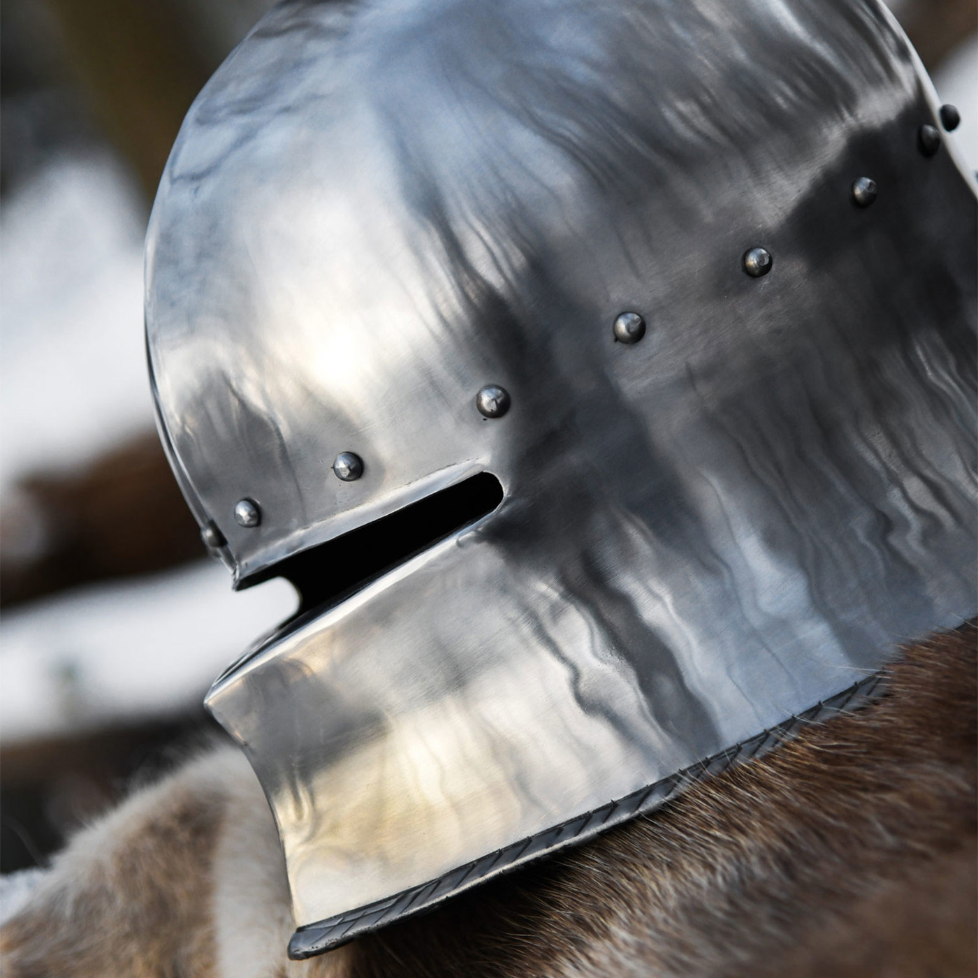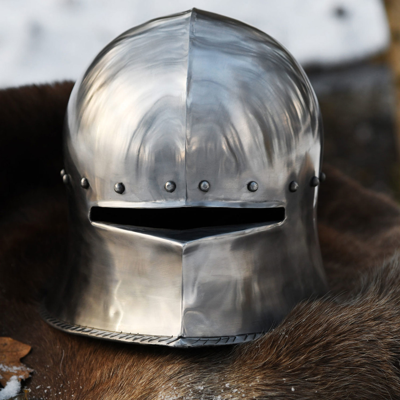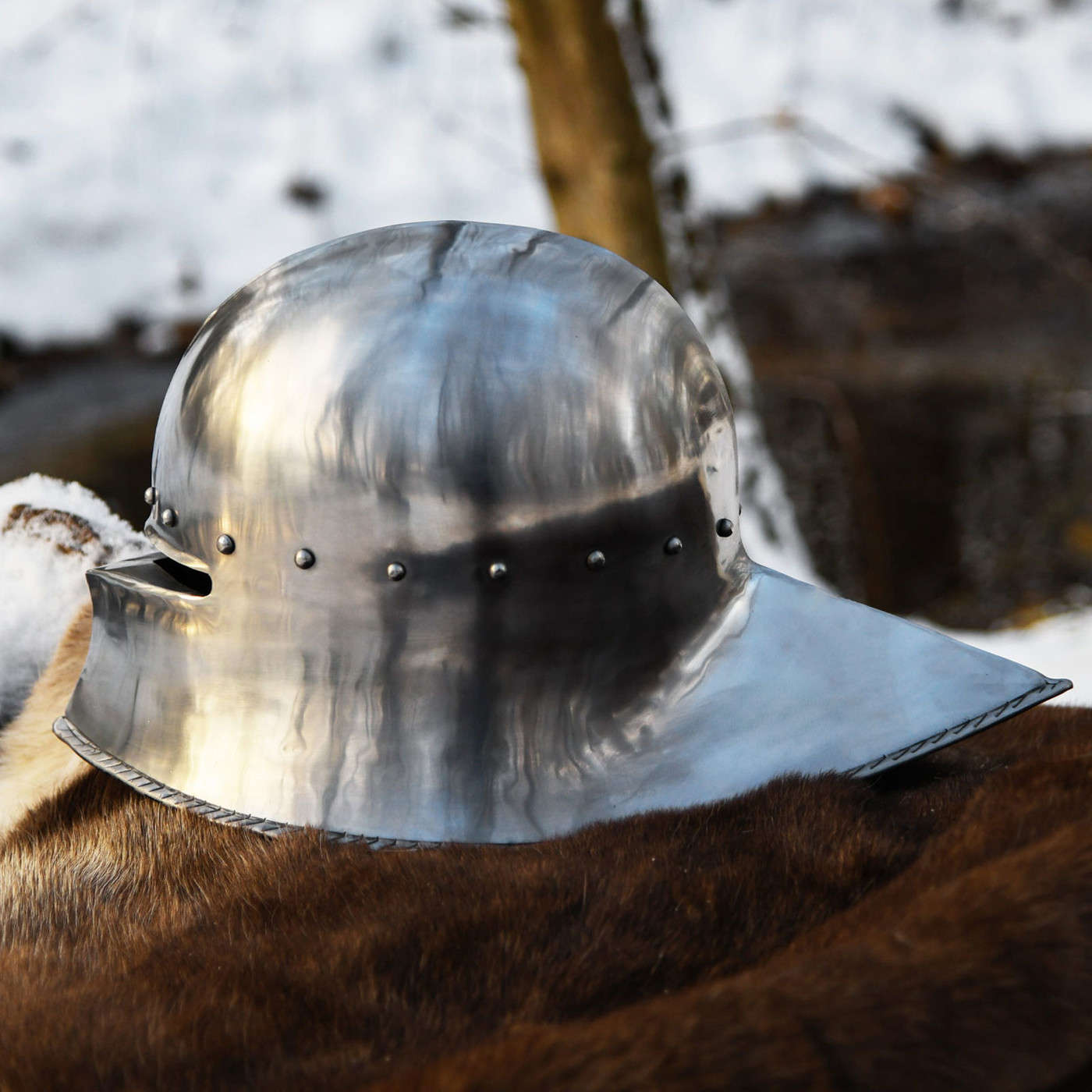 Ein kalter Wind zieht über das Schlachtfeld, Metall trifft auf Metall, und der dumpfe Klang eines Hiebs hallt durch die Luft. Du ziehst den Helm tiefer ins Gesicht – der Sehschlitz verengt die Welt auf das Wesentliche: Fokus, Schutz, Entschlossenheit. Genau dieses Gefühl bringt dir dieser deutsche Schaller Helm um 1480 zurück.