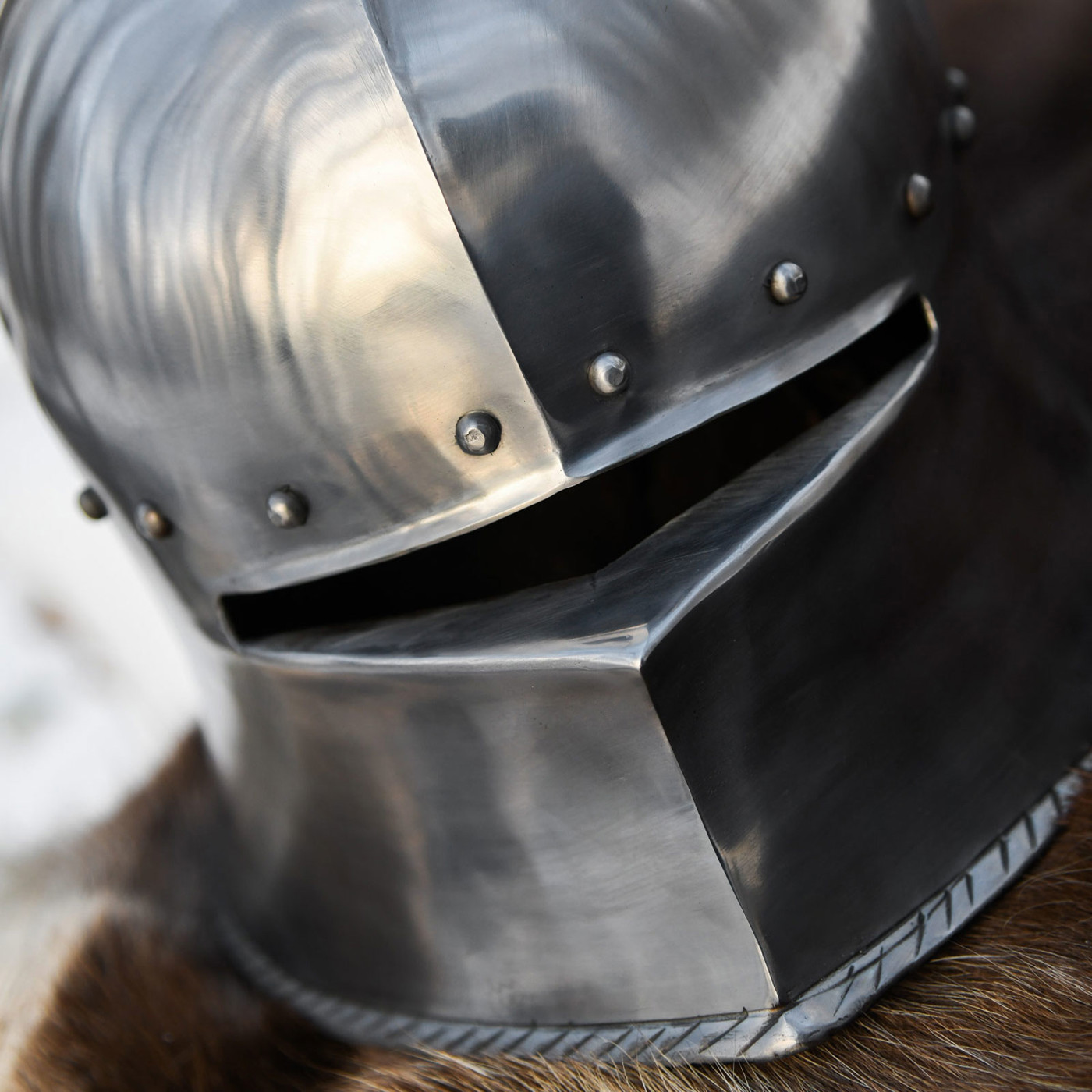 Der ausladende Nackenschutz legt sich schützend über den Hinterkopf und erinnert an die taktische Raffinesse mittelalterlicher Rüstungsschmiede. Der schmale Sehschlitz – wie auf den Bildern gut erkennbar – bietet ein ausgewogenes Verhältnis zwischen Sichtfeld und maximalem Schutz. Gleichzeitig sorgt die nach vorne gezogene Form für eine natürliche Luftzirkulation.