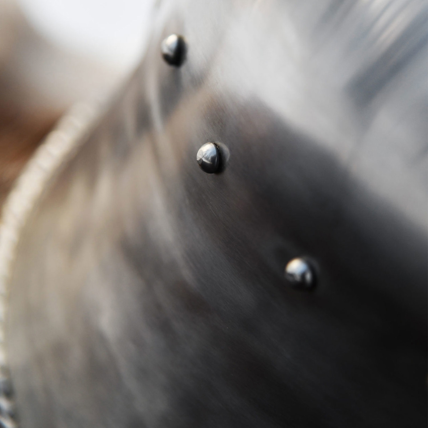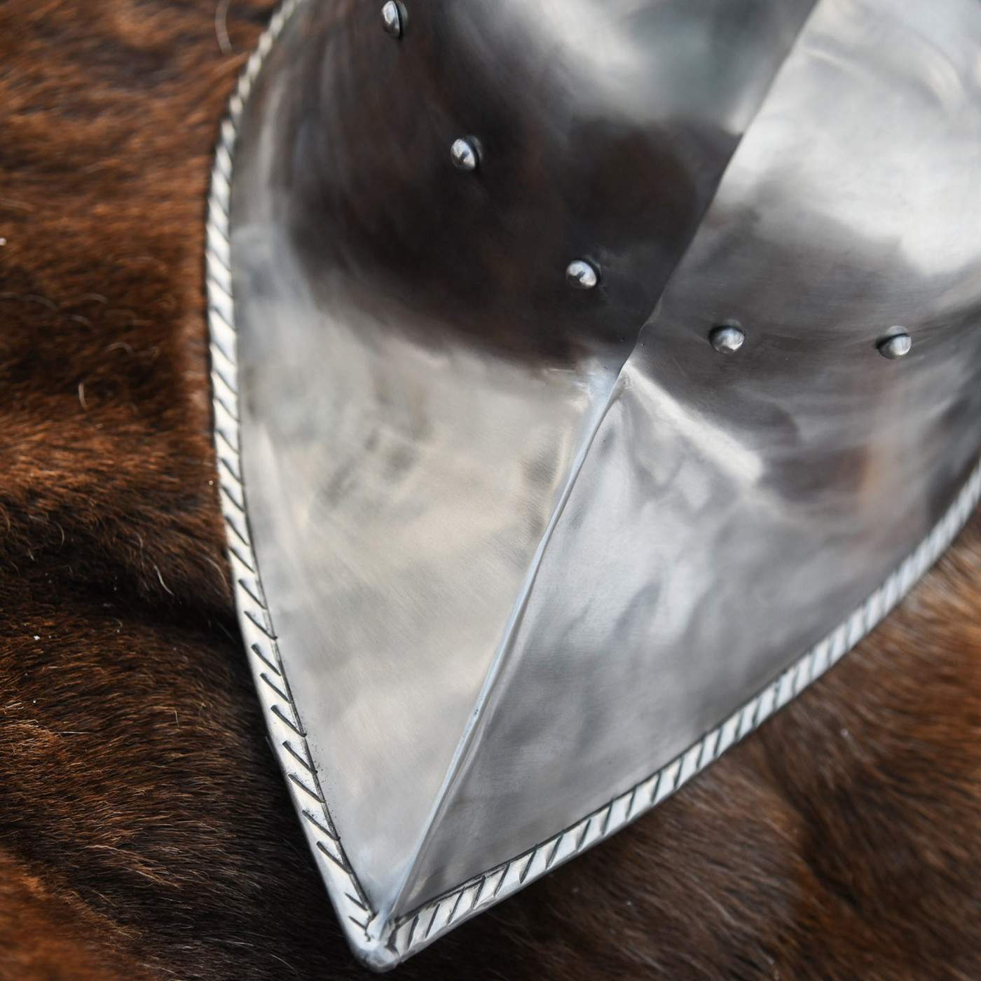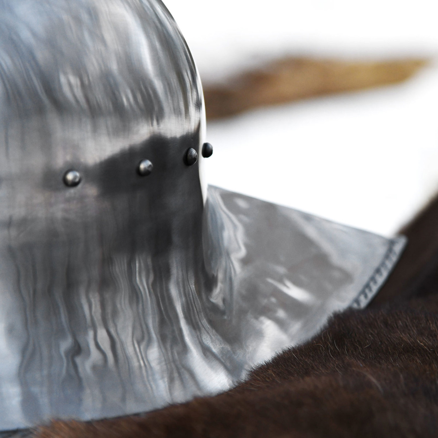 Schon beim ersten Blick auf den Helm wird klar: Hier wurde nichts dem Zufall überlassen. Die glatt polierte Stahloberfläche reflektiert das Licht in weichen, fast fließenden Linien – Spuren der handwerklichen Verarbeitung, die dem Helm seinen authentischen Charakter verleihen. Der markante Grat entlang des Scheitels sorgt nicht nur für Stabilität, sondern unterstreicht auch die kraftvolle Silhouette.