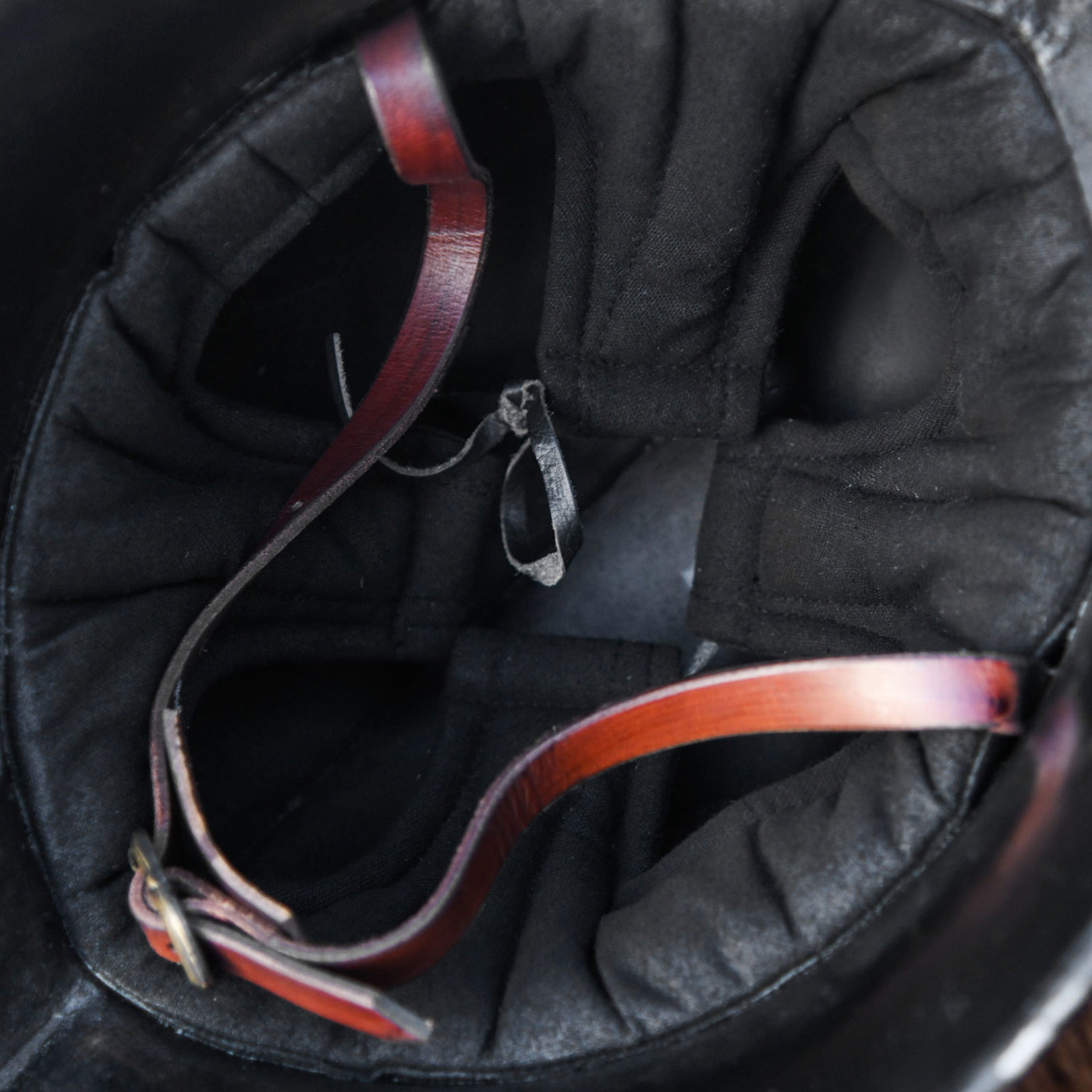 Im Inneren überzeugt der Helm mit durchdachter Funktionalität: Ein gepolstertes, vernietetes Stoffinlay garantiert Tragekomfort auch bei längeren Einsätzen im Schaukampf oder Reenactment. Der robuste Leder-Kinnriemen mit antik wirkender Messingschnalle hält den Helm sicher an Ort und Stelle – selbst in intensiven Kampfszenen.