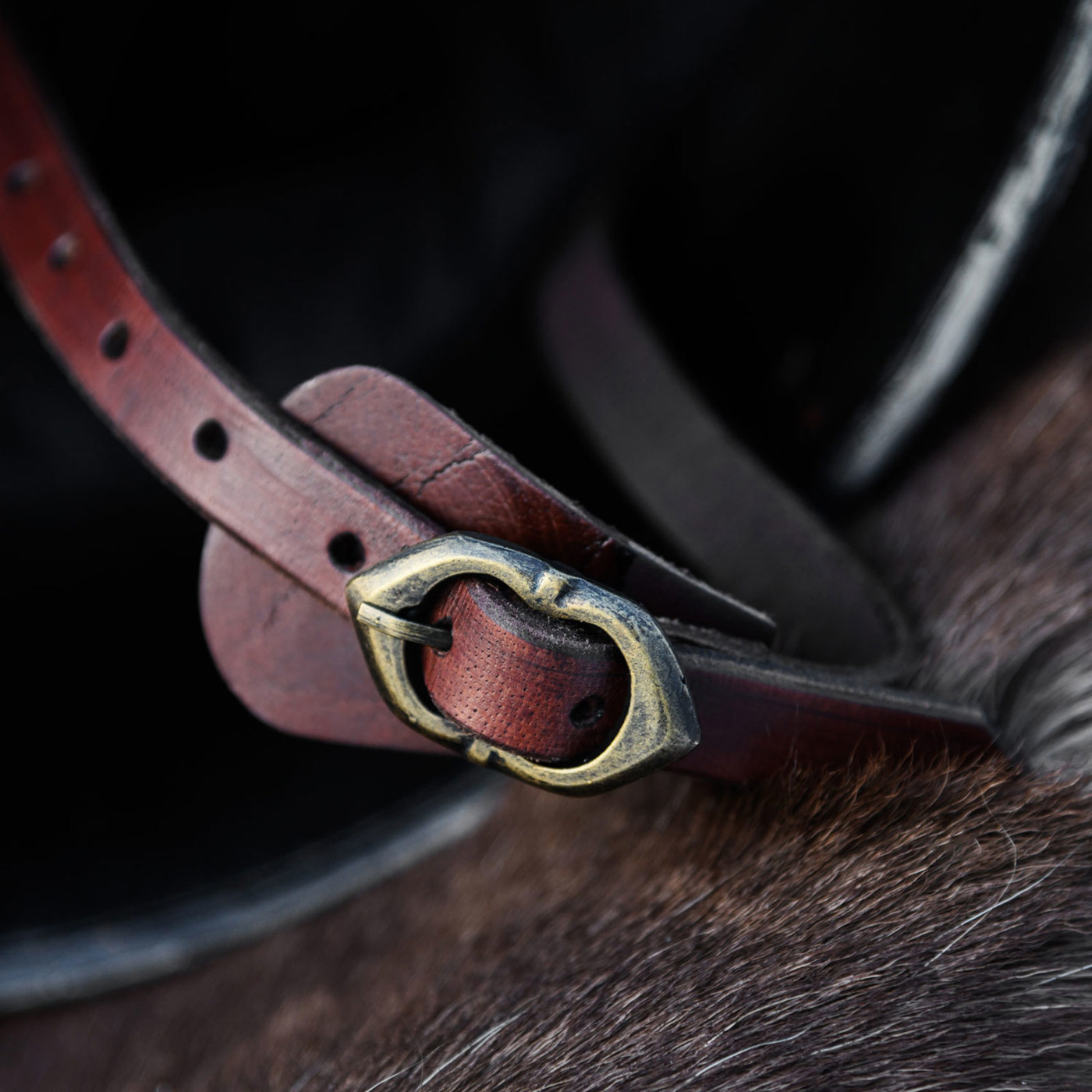 - Kinnriemen: 2 mm Leder mit Messingschnalle (Antik-Finish)