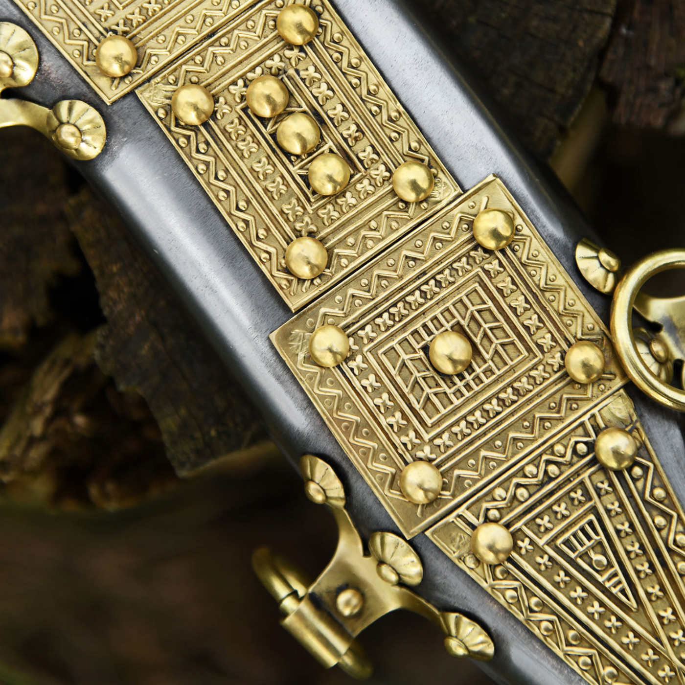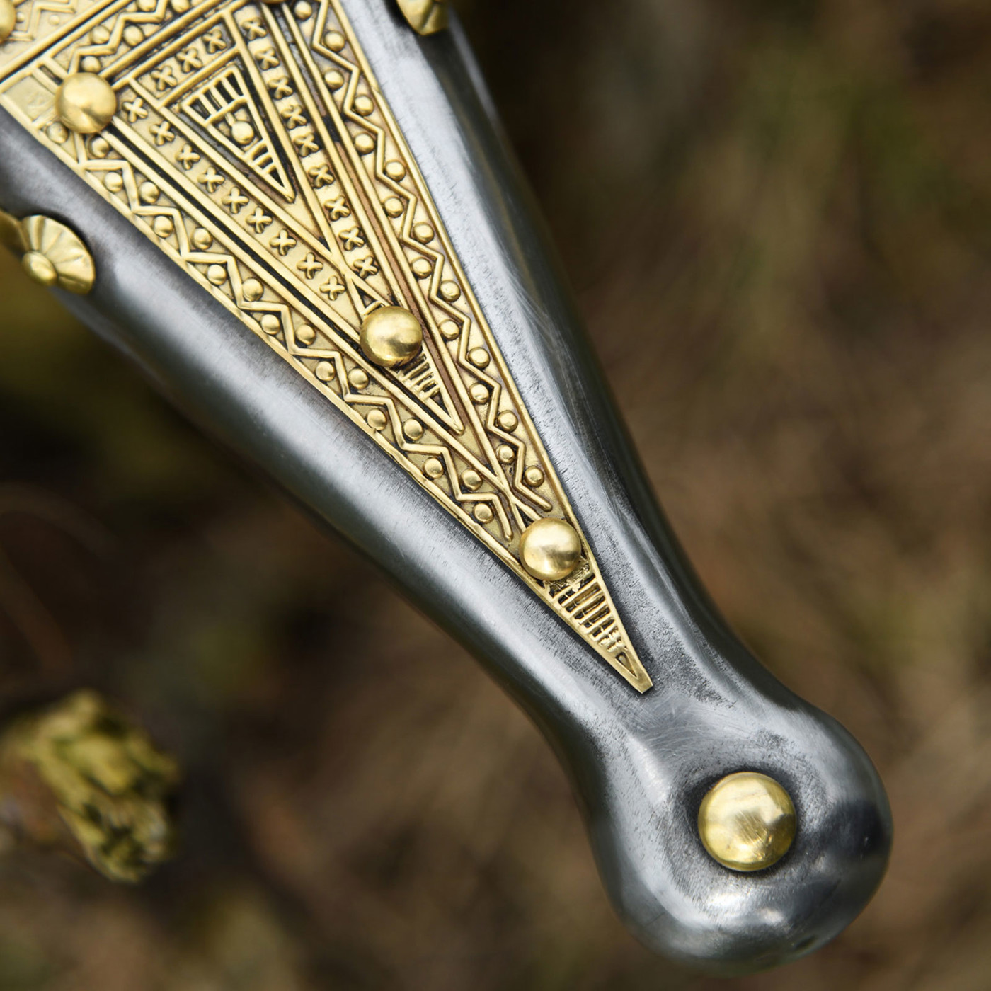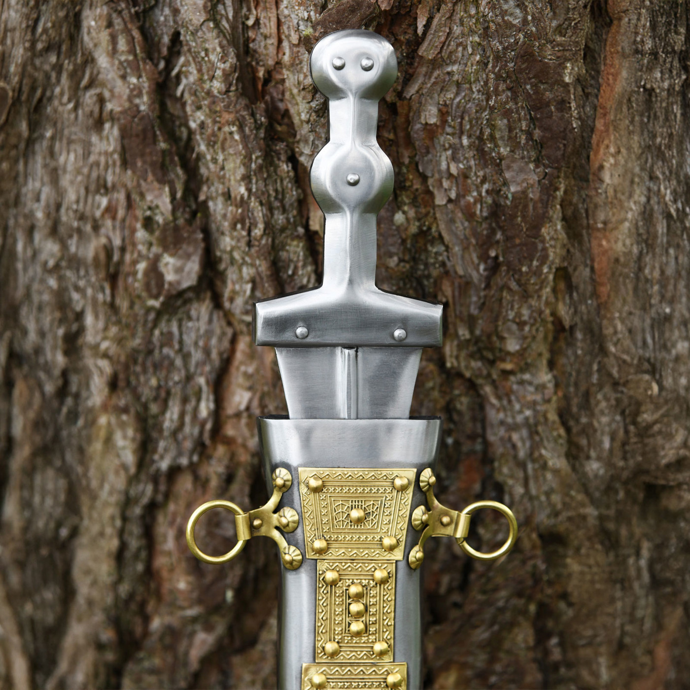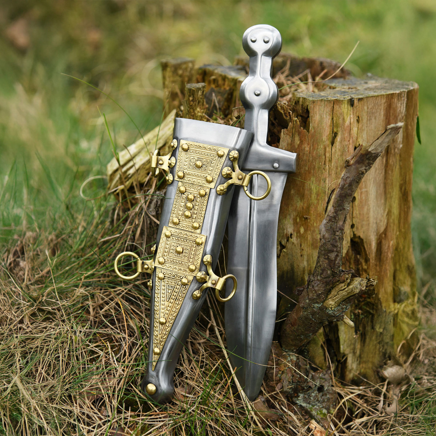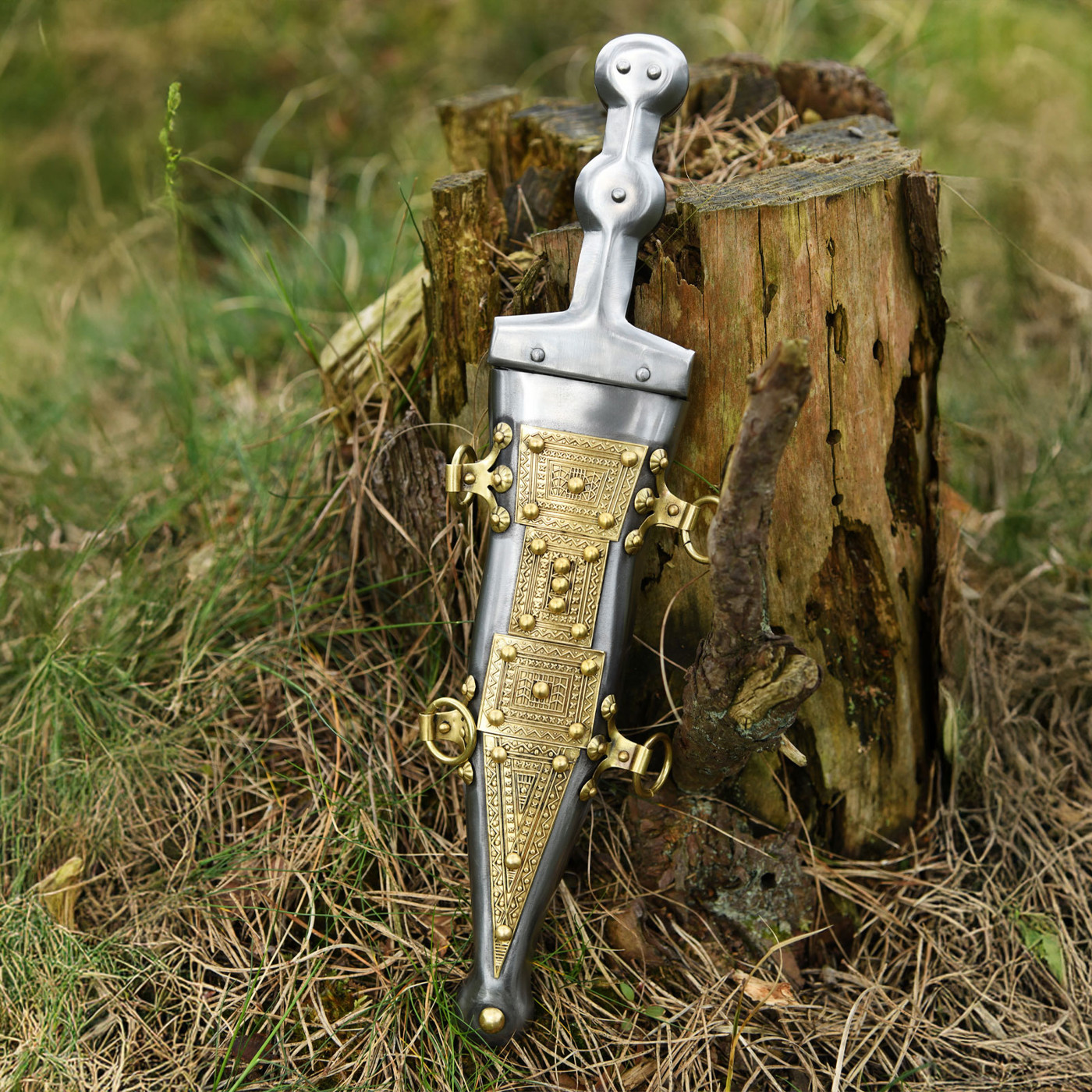 Der Höhepunkt dieses prächtigen Dolchs ist zweifellos die dekorative Metallscheide, die mit kunstvollen Messingbeschlägen verziert ist. Diese Verzierungen sind ein wahrer Blickfang und verleihen dem Dolch eine einzigartige ästhetische Note. Egal, ob Sie ein Sammler antiker Waffen sind oder einfach nur die Schönheit und Handwerkskunst der römischen Ära schätzen, dieser Pugio wird Ihren Ansprüchen gerecht werden.