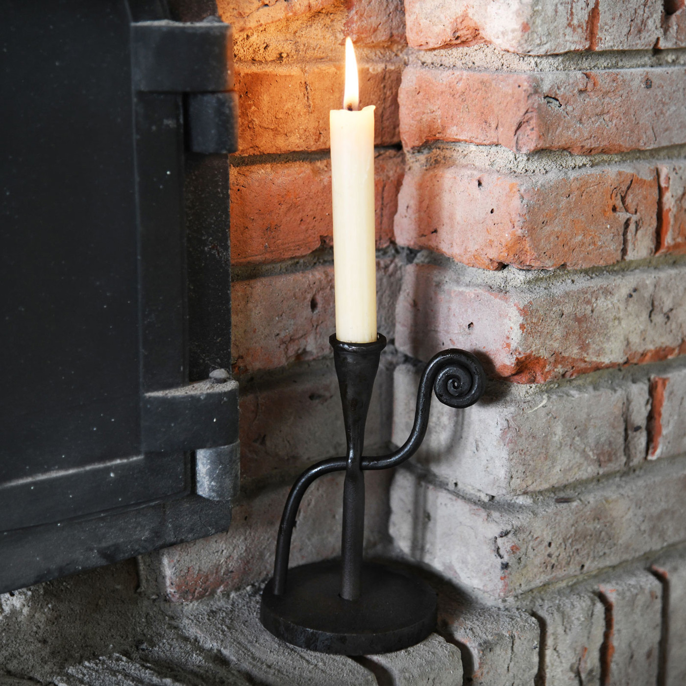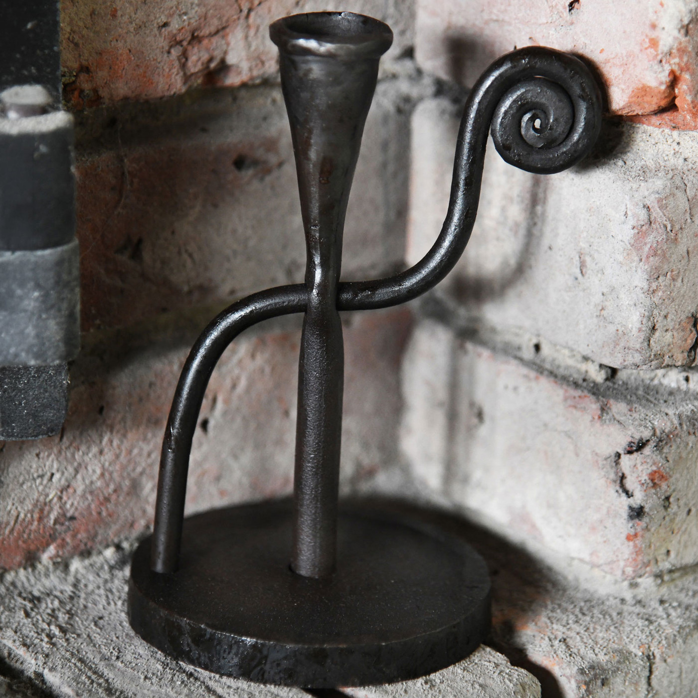Auf den Bildern erkennst du die robuste, leicht glänzende Oberfläche, die durch den Schmiedeprozess entstanden ist. Die elegante, aber zugleich kraftvolle Linienführung verleiht dem Kerzenständer eine besondere Dynamik: Der Standfuß sorgt für Stabilität, während sich die geschmiedete Strebe sanft nach oben windet und in einer kunstvollen Spirale endet. Die konische Tülle hält die Kerze sicher und unterstreicht den historischen Charakter.