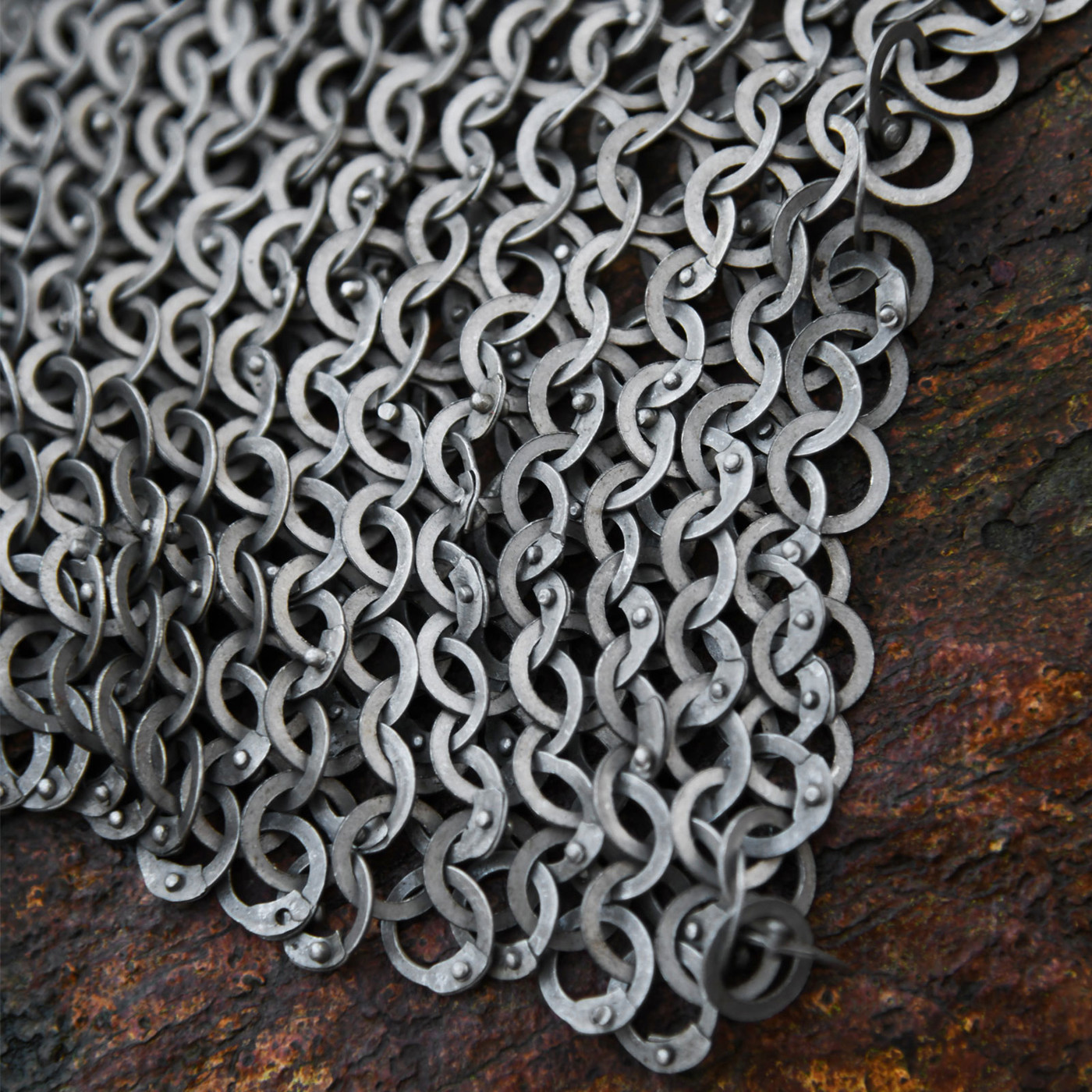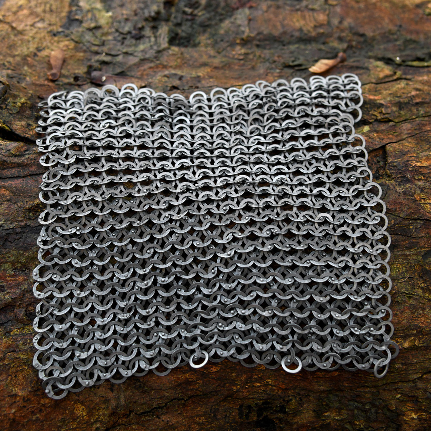 Dieses quadratische Kettengeflecht könnte genauso gut dort entstanden sein. Mit seinem klassischen europäischen Flachring-Design und den teils vernieteten Rundnieten erinnert es an die Rüstungsteile, die zwischen Antike und Spätmittelalter unzähligen Kriegern Schutz boten.