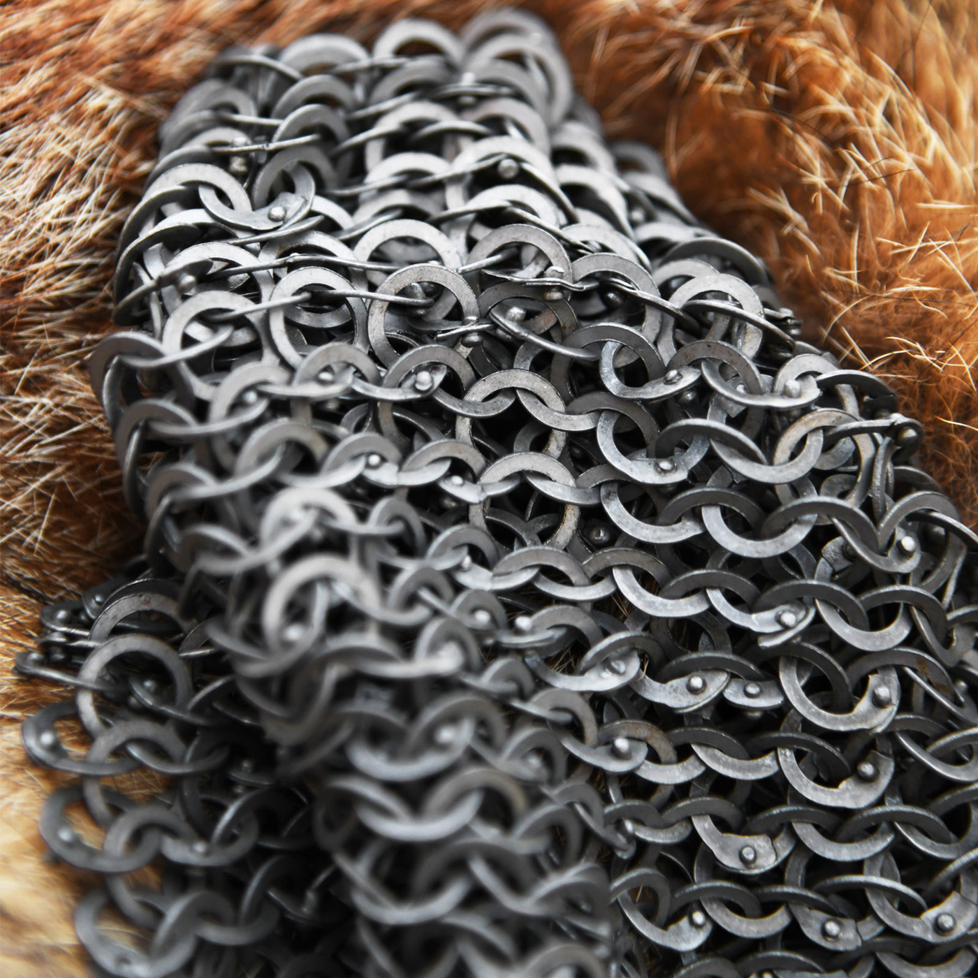 Die handwerklich anmutende Struktur, die flachen Ringe und die sichtbaren Rundnieten sorgen für ein unverkennbar historisches Erscheinungsbild, das sich auch hervorragend für Reenactment, LARP, Museumsdarstellungen oder professionelle Filmrequisiten eignet.