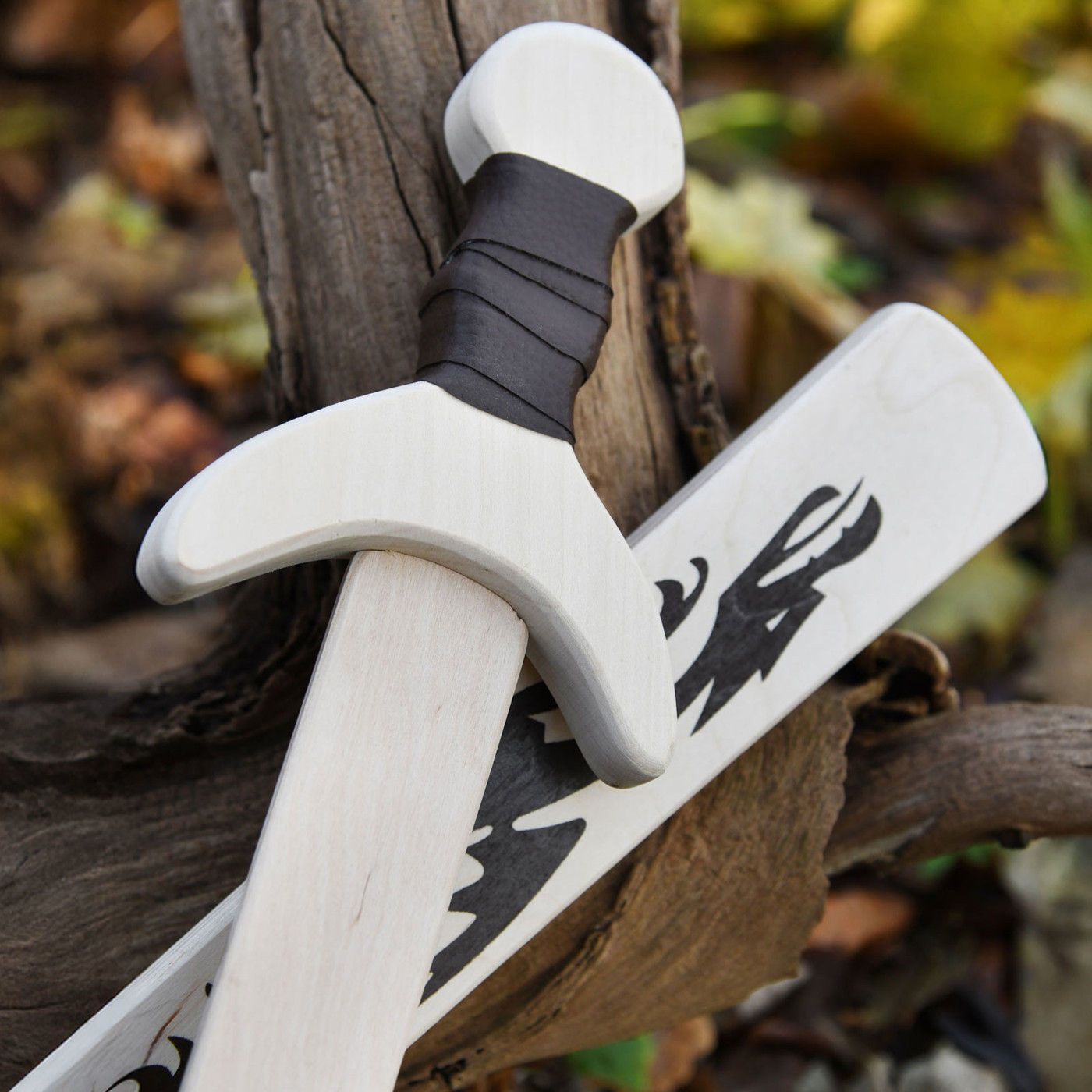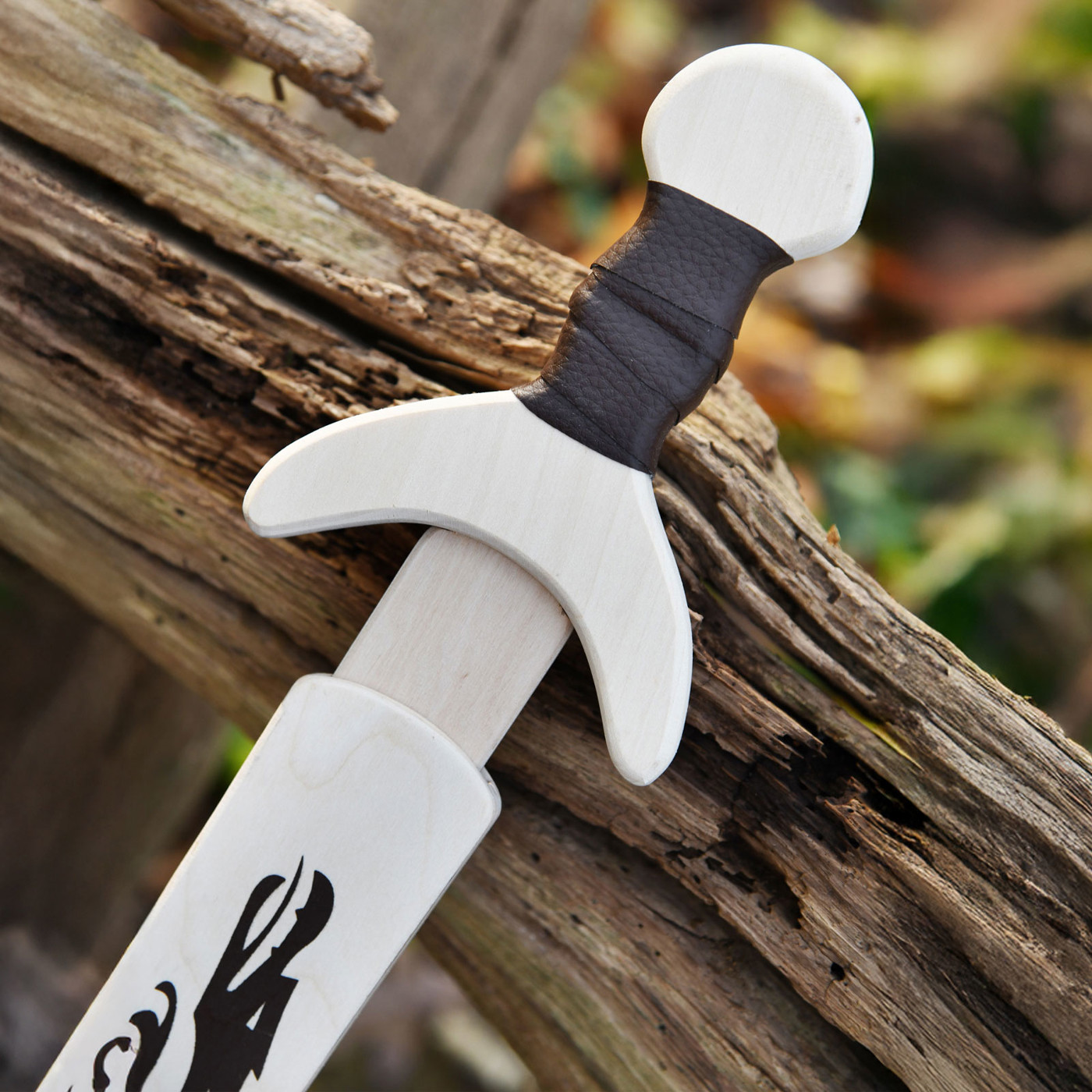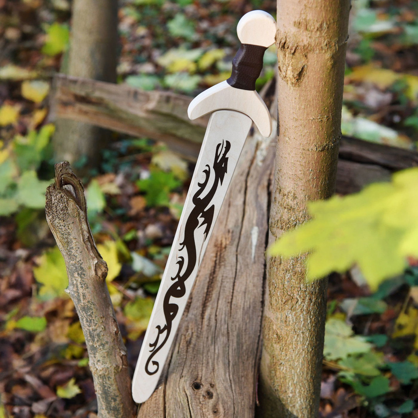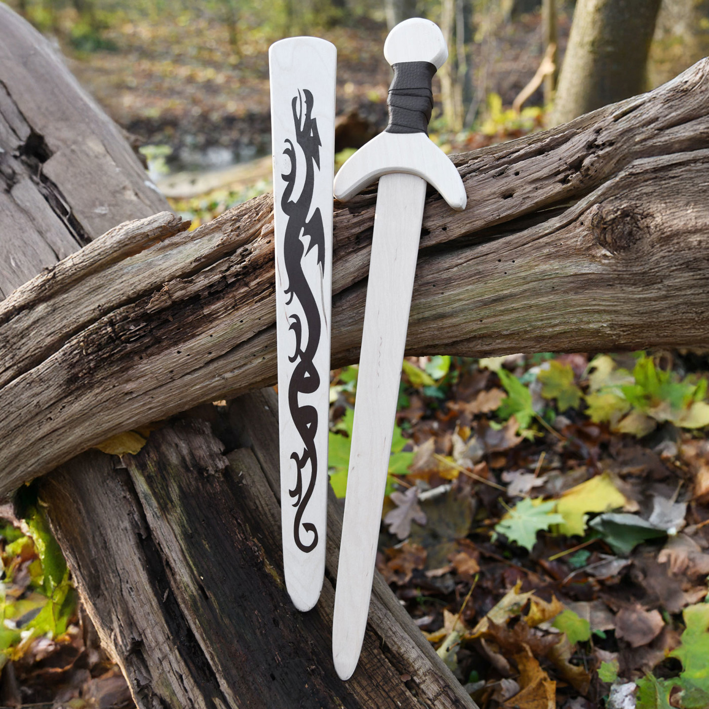 Gefertigt aus hochwertigem, unbehandeltem Holz, liegt das Schwert leicht und sicher in kleinen Händen. Der mit Lederband umwickelte Griff sorgt für optimalen Halt, während die glatte Oberfläche angenehm in der Hand liegt. Die detailreiche Drachenverzierung auf der Scheide macht jedes Schwert zu einem echten Hingucker – ganz wie die Waffen der edlen Ritter vergangener Zeiten.