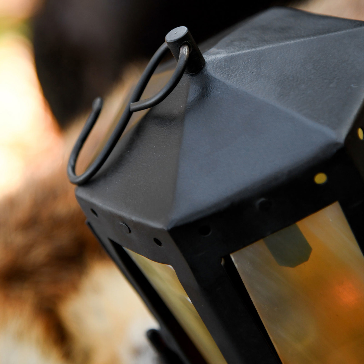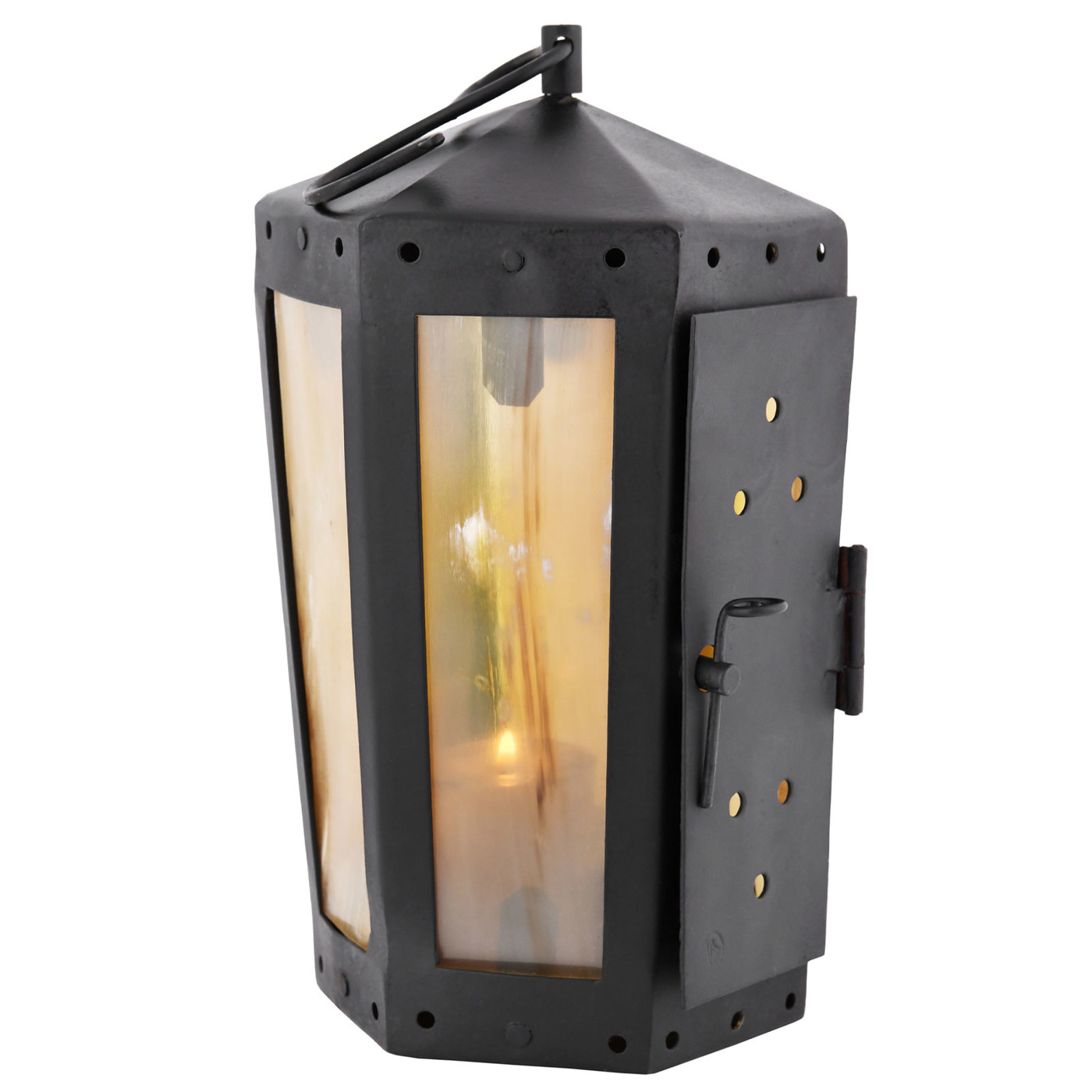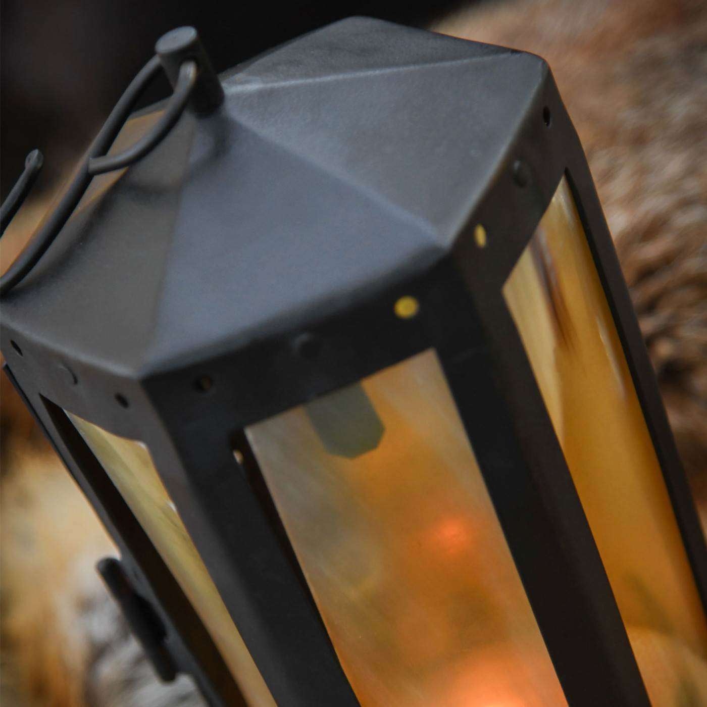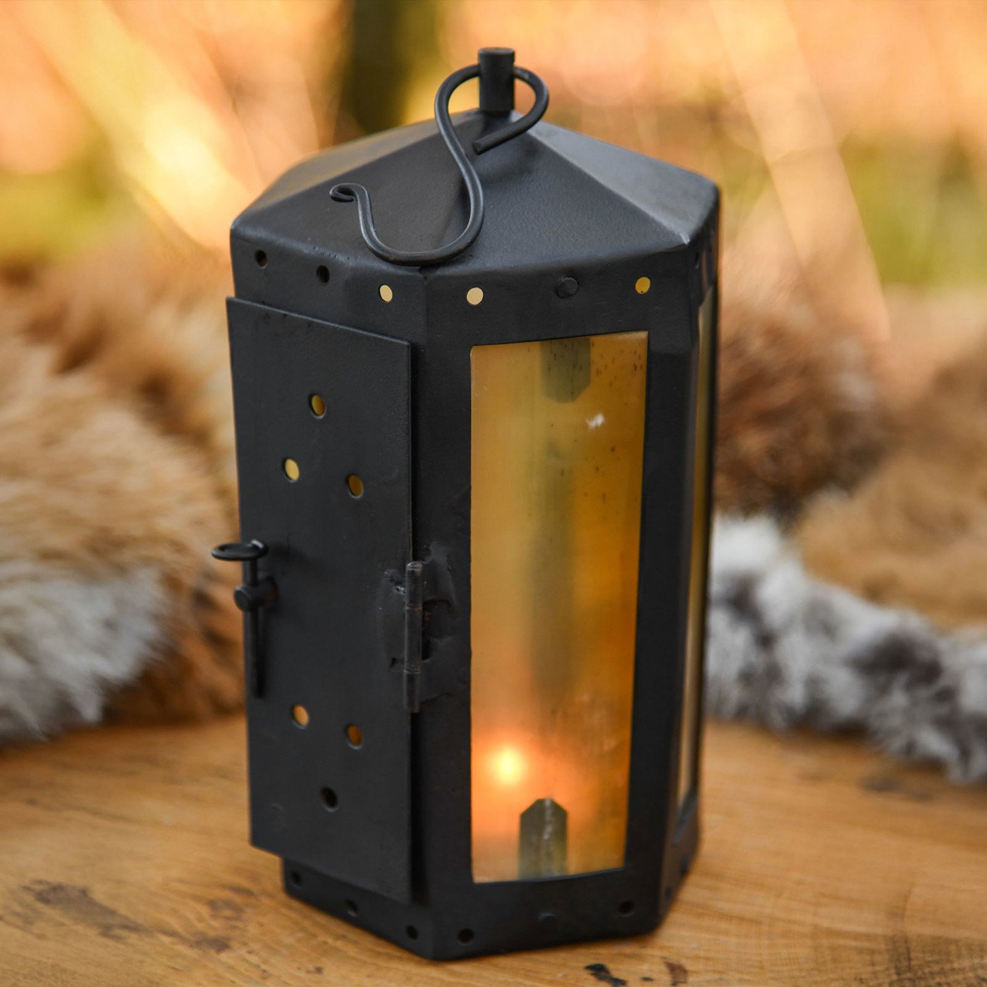 Diese handgeschmiedete Laterne greift genau dieses Gefühl auf. Mit ihrer sechseckigen Form, den vernieteten Eisenteilen und den echten Hornfenstern ist sie eine authentische Nachbildung historischer Beleuchtung des späten Mittelalters bis zur Renaissance. Jede Laterne wird in traditioneller Handwerkskunst gefertigt – kein Stück gleicht dem anderen, und gerade das macht ihren Reiz aus.