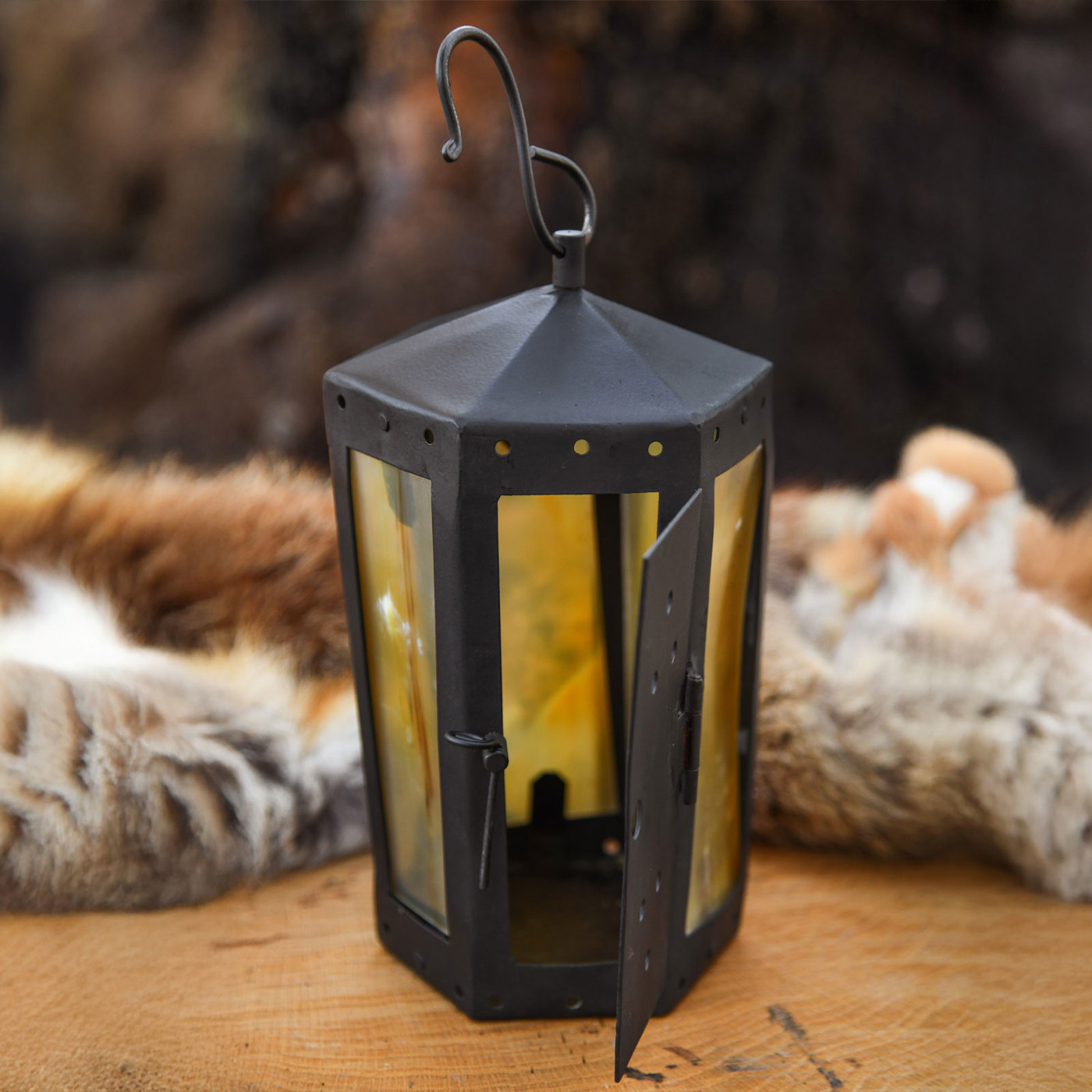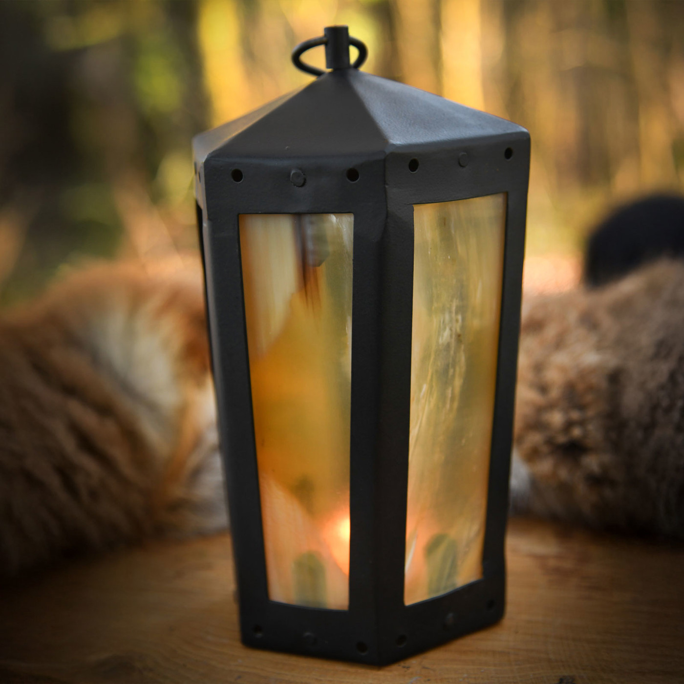 Mittelalterliche Laterne mit Hornfenstern – Handgeschmiedete Eisenlaterne, 6-eckig, ca. 20 cm