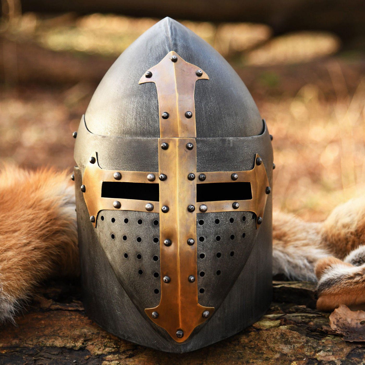 Der Helm orientiert sich am Hoch- bis frühen Spätmittelalter (ca. 1200–1350) und passt ideal zu Darstellungen von Rittern und Kreuzfahrern.