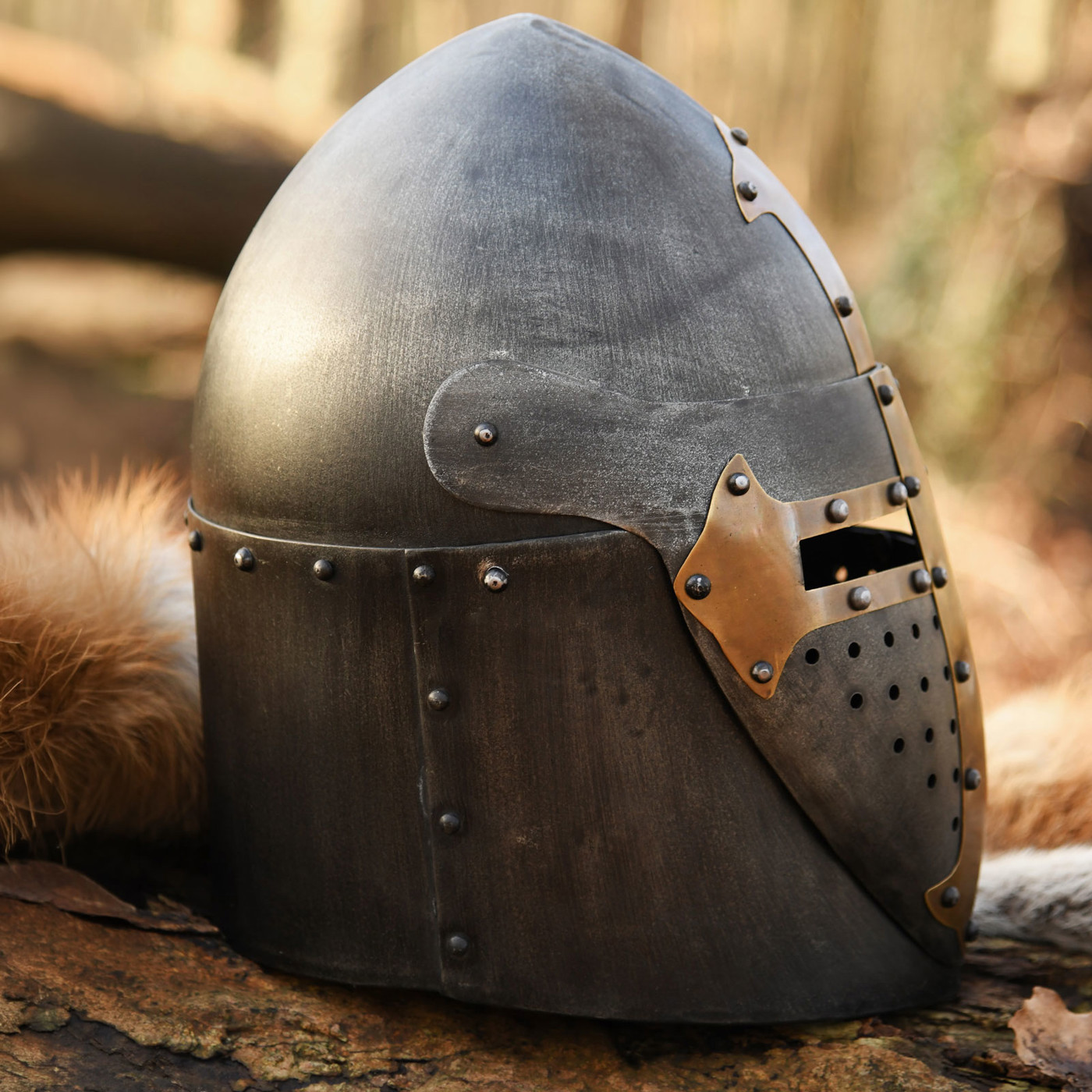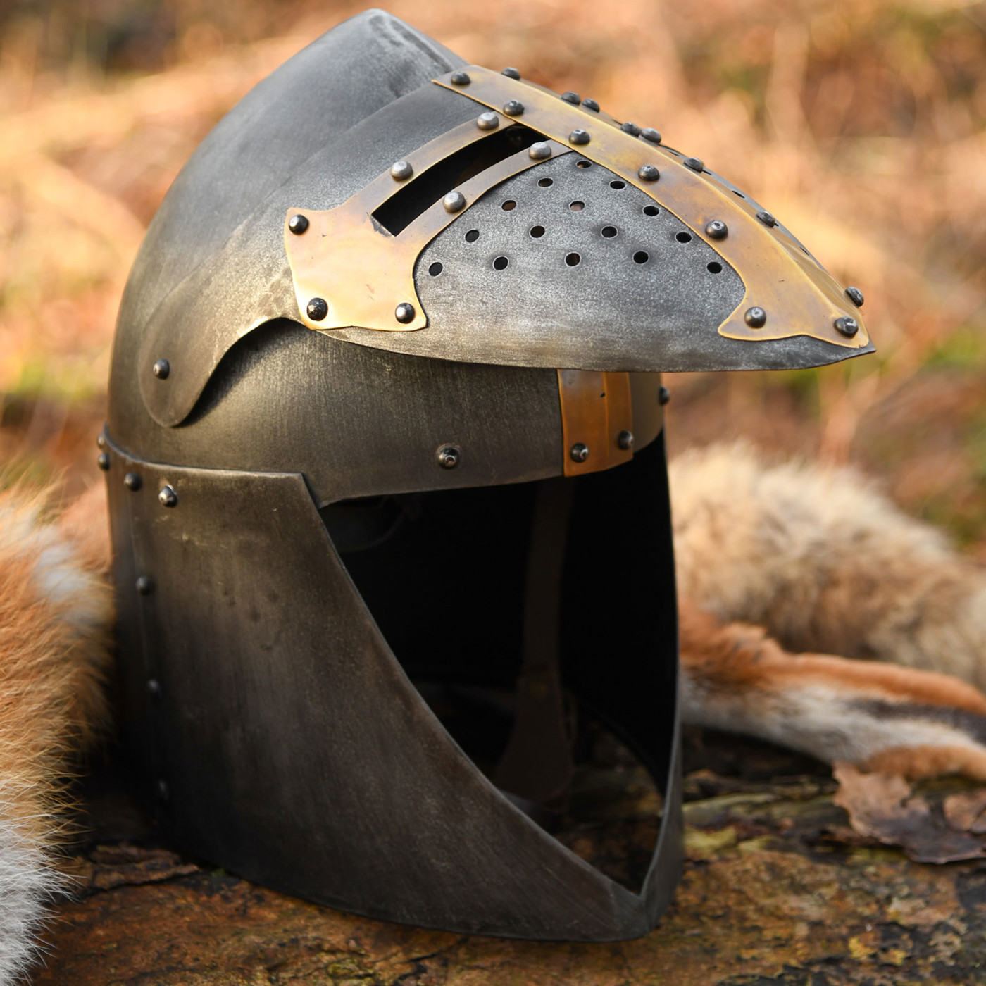 - Typ: Mittelalterlicher Topfhelm / Kübelhelm mit Klappvisier