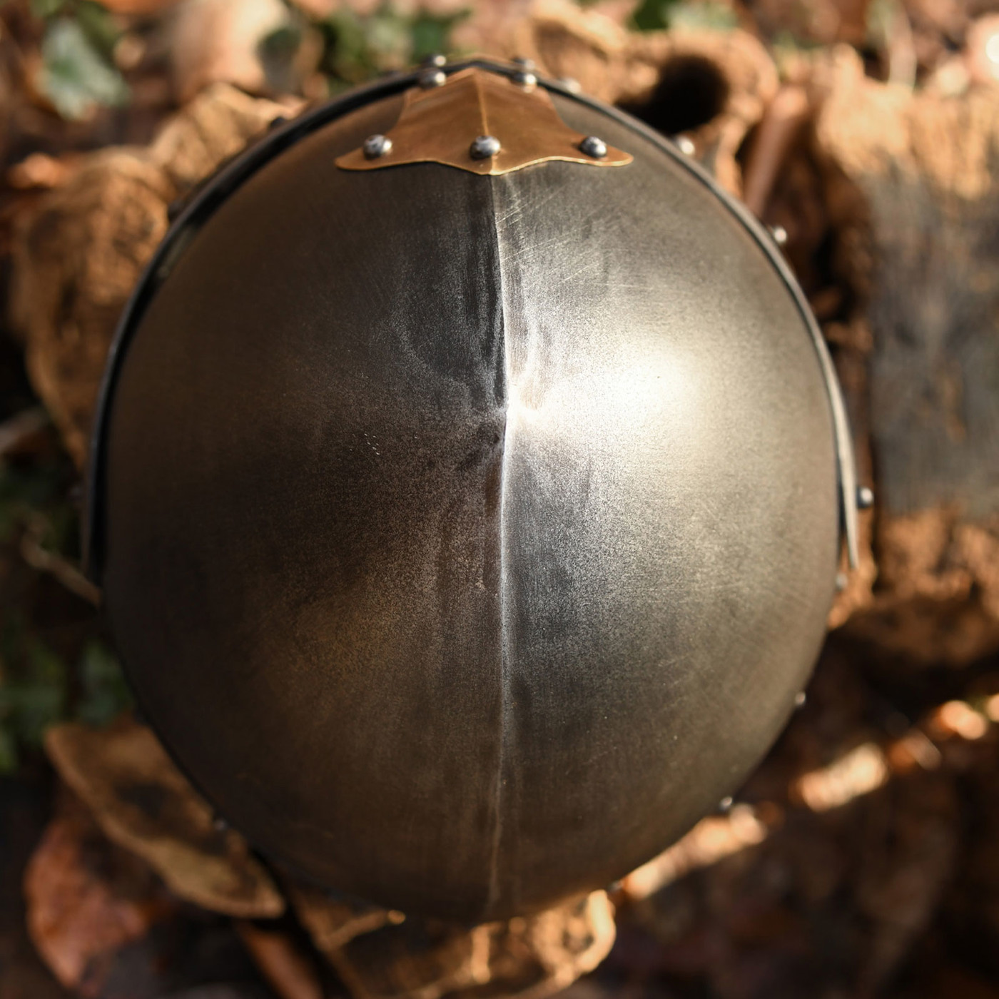 - Material: Stahlhelm mit Messingapplikationen