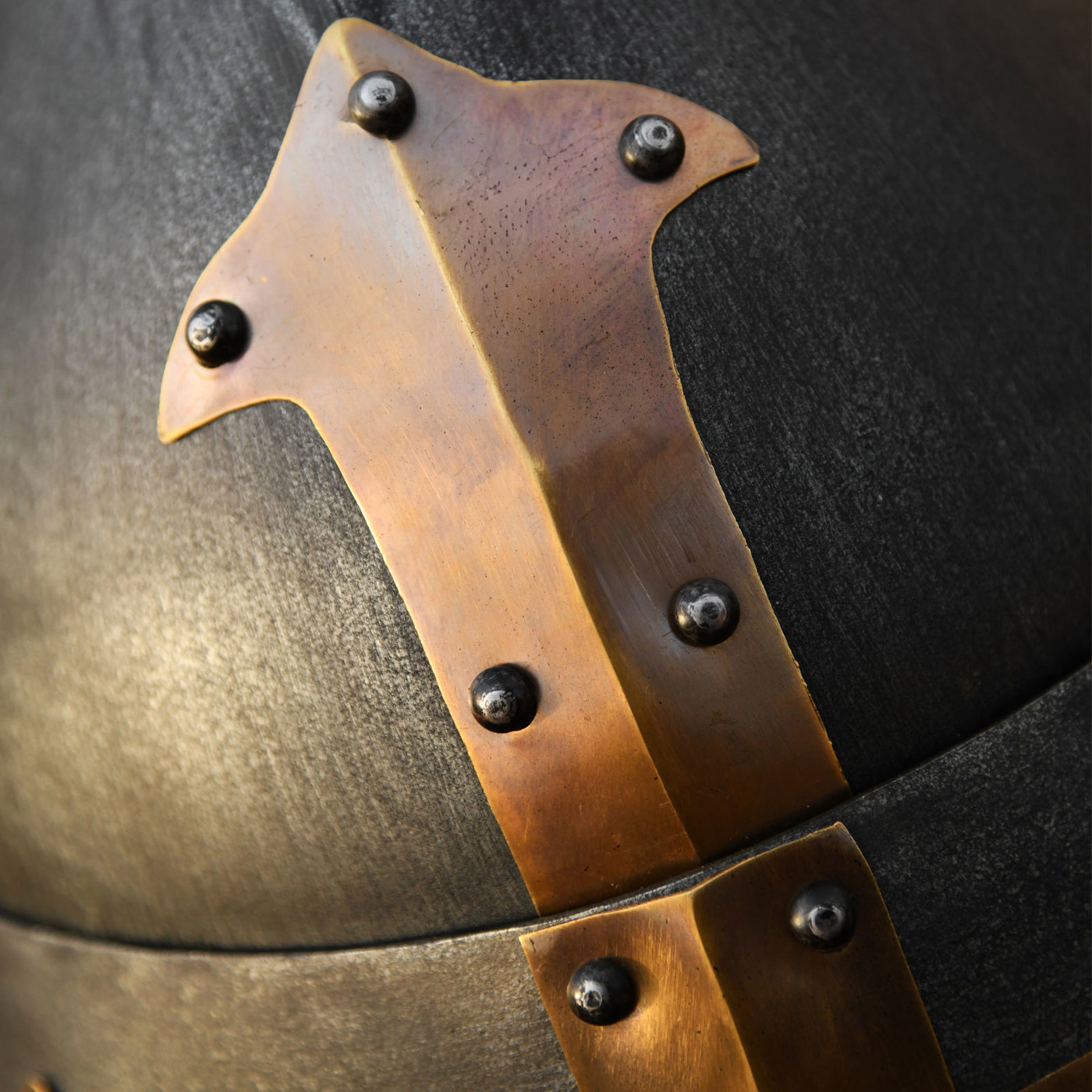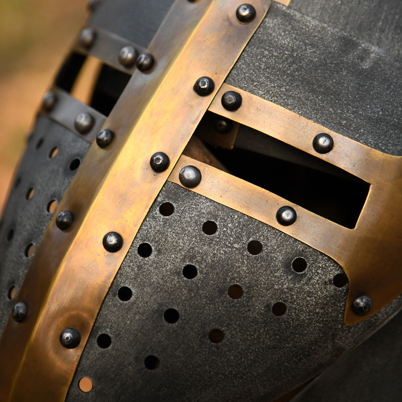 Auf den Bildern wird die hochwertige Verarbeitung sofort sichtbar: Die fein gesetzten Nieten, die strukturierte, leicht patinierte Oberfläche und das durchdachte Visier mit Belüftungsöffnungen zeigen, dass dieser Helm nicht nur ein Dekorationsstück ist – sondern ein echtes Statement. Die Kombination aus dunklem Stahl und warm schimmerndem Messing verleiht ihm eine authentische, historische Ausstrahlung.