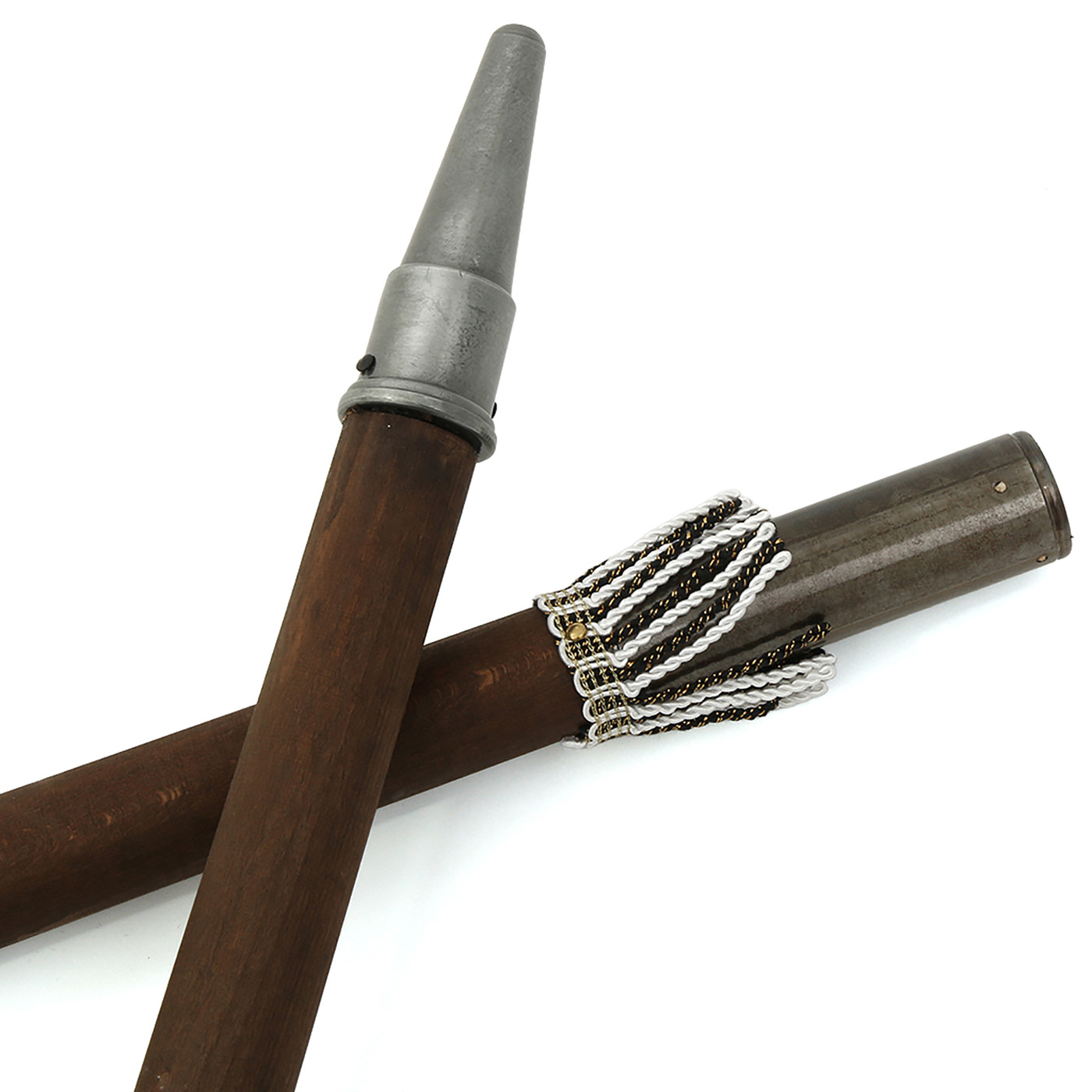 Der lange, dunkle Holzschaft (wird geteilt geliefert) unterstreicht den authentischen Charakter der Waffe. Mit einer Gesamtlänge von rund 205 cm entspricht diese Replik den historischen Dimensionen originaler Hellebarden, wie sie von Landsknechten und Schweizer Söldnern geführt wurden. Die dekorativen Quasten setzen zusätzliche Akzente und verleihen der Hellebarde einen repräsentativen, beinahe herrschaftlichen Ausdruck. Farbe und Ausführung der Quasten können dabei variieren.