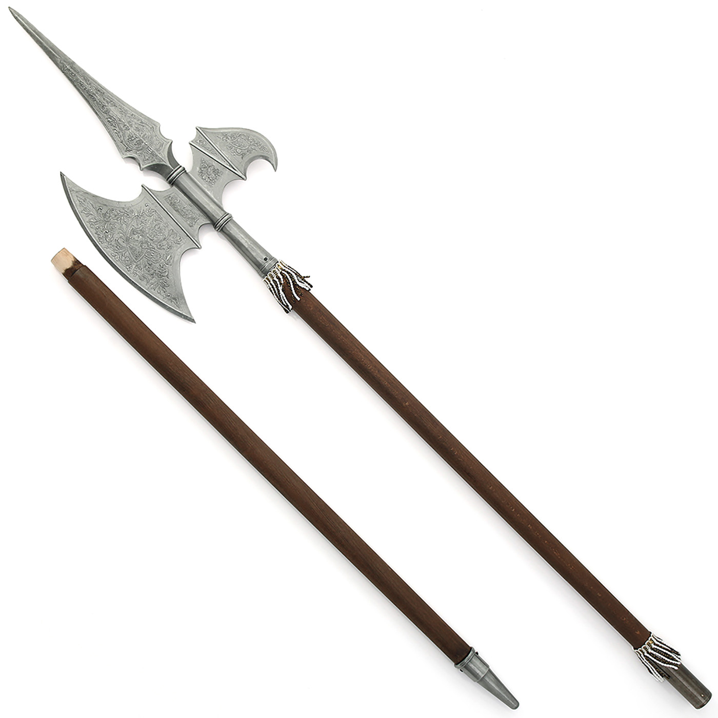 Schon auf den ersten Blick überzeugt das detailreich gearbeitete Blatt: Die Kombination aus langer Stoßspitze, breiter Axtklinge und seitlichem Haken zeigt eindrucksvoll, warum die Hellebarde als eine der vielseitigsten Waffen des Mittelalters galt. Feine Gravuren auf dem metallischen Waffenkopf verleihen dem Stück eine edle, fast zeremonielle Anmutung – ideal für Sammler, Reenactment-Enthusiasten oder als imposantes Dekorationsobjekt.