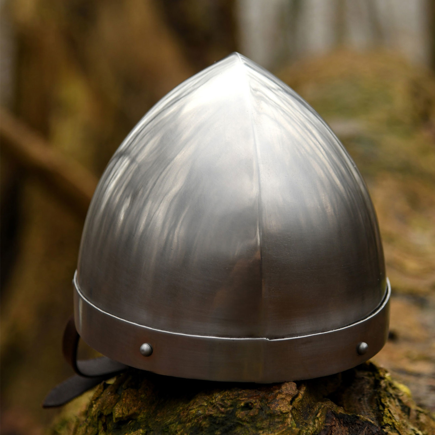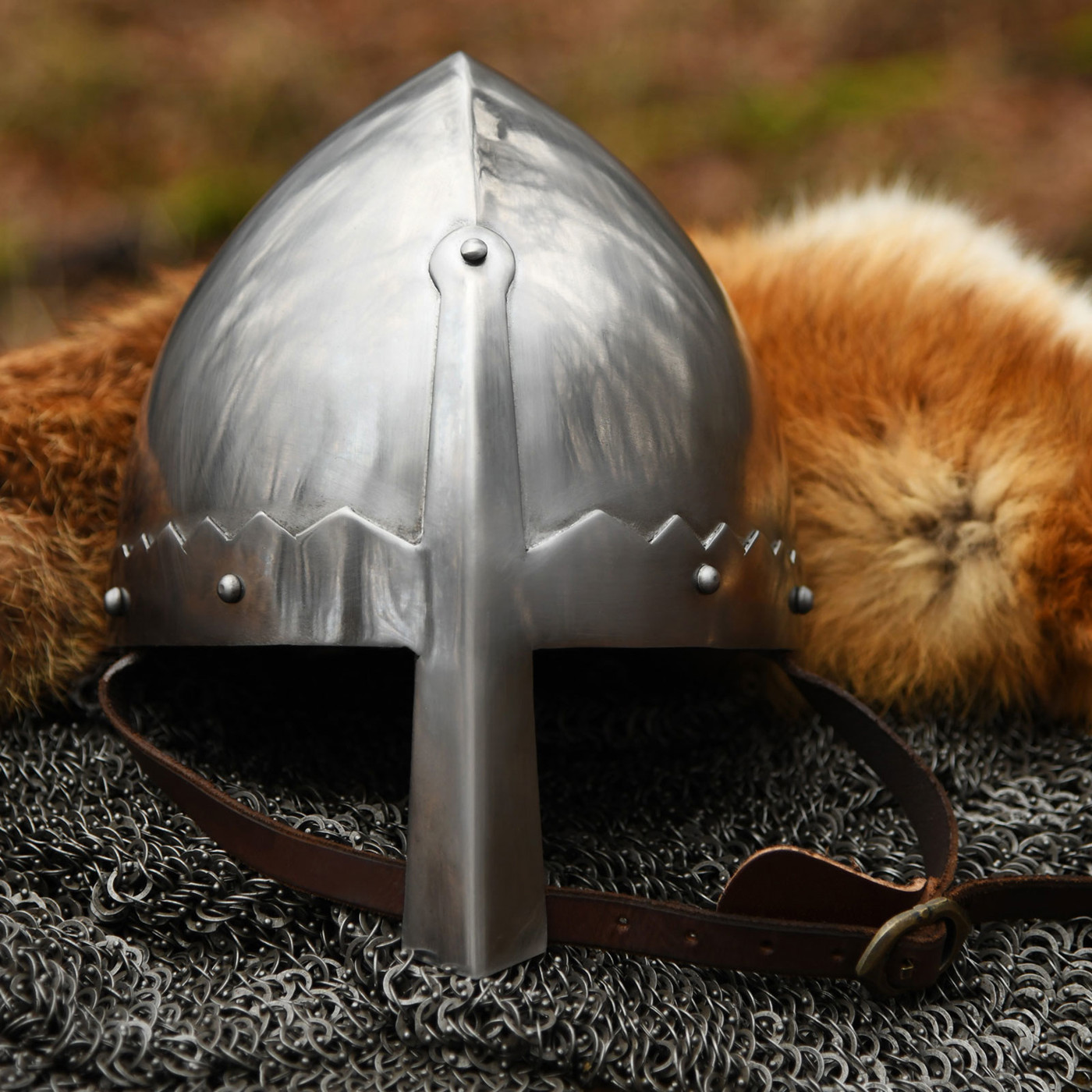 Spüre die Macht der Vergangenheit – mit diesem normannischen Nasalhelm trittst du in die Fußstapfen der Krieger des 11. Jahrhunderts, die Mut, Ehre und Stahl zu einer unvergesslichen Legende schmiedeten.
