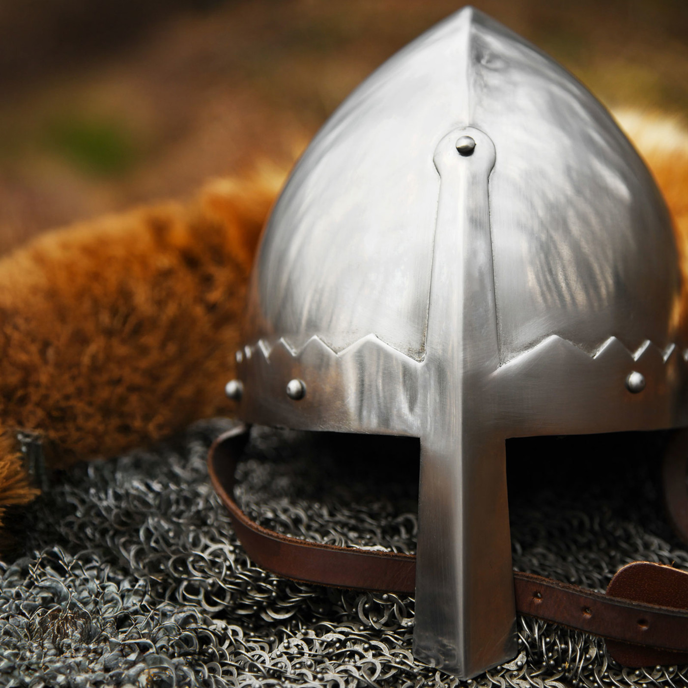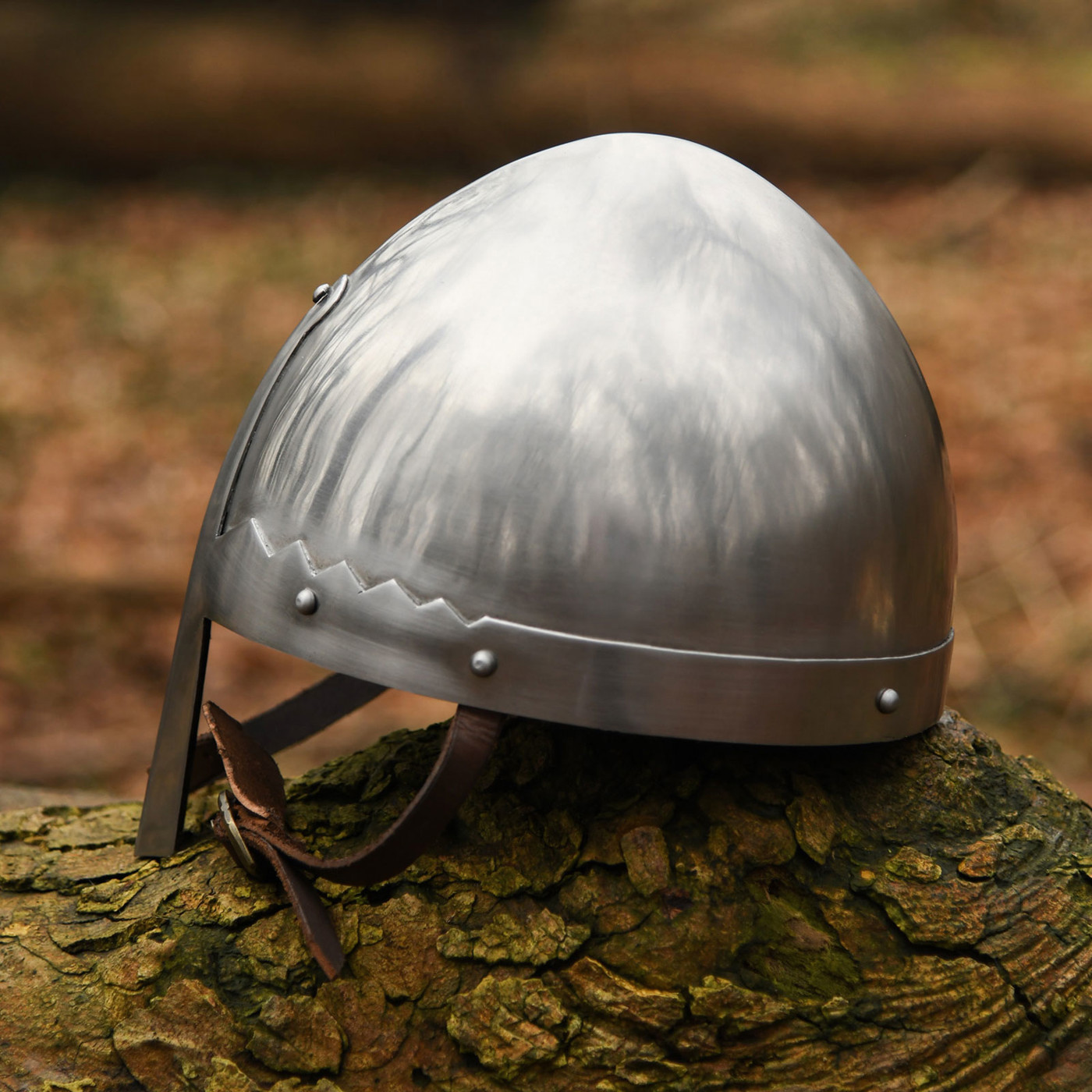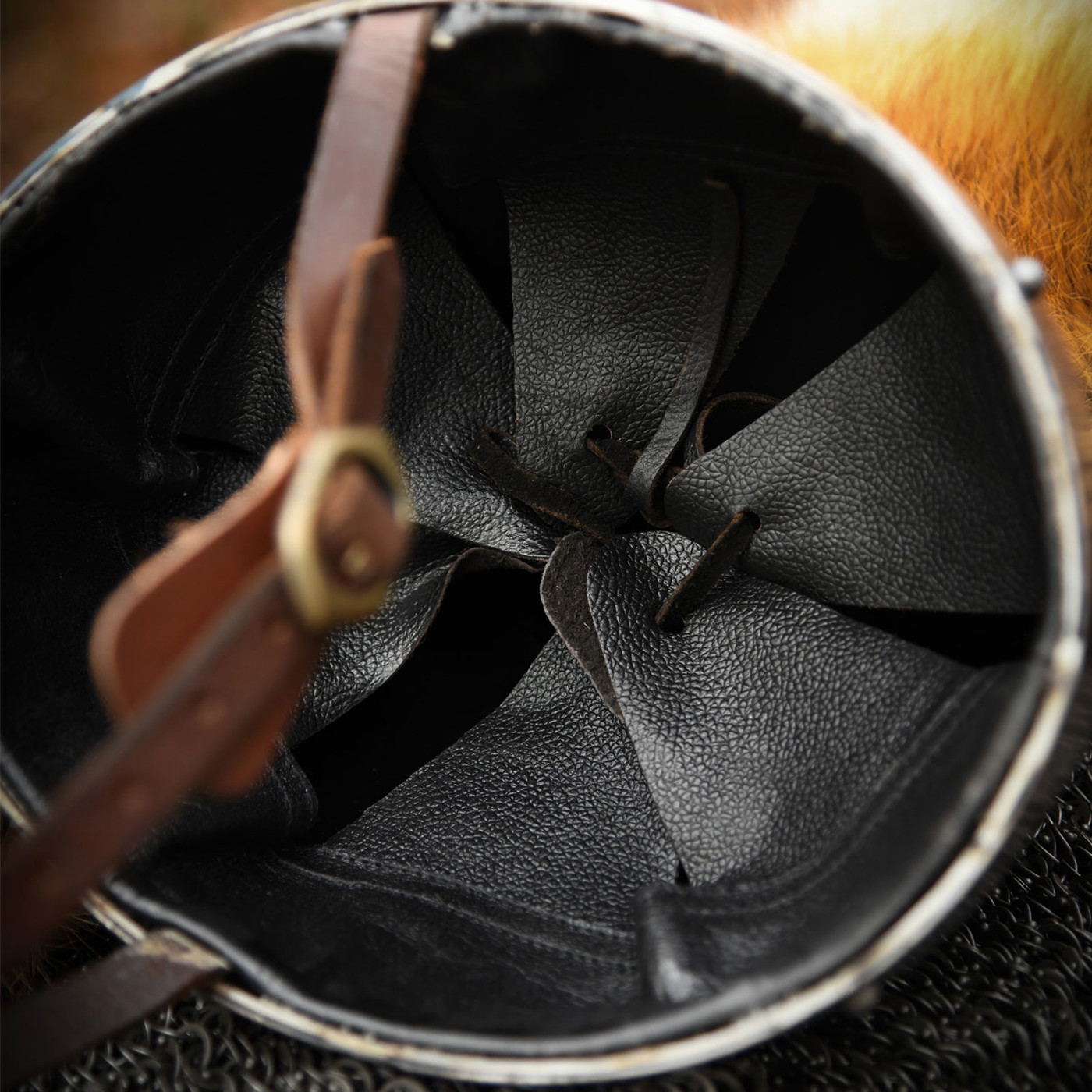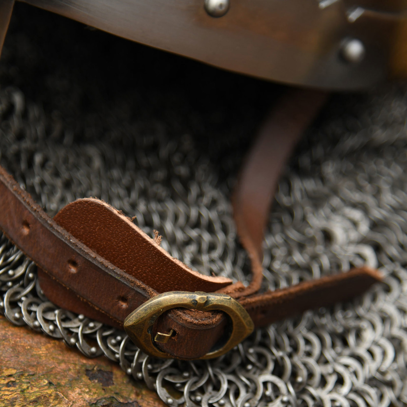Der präzise gefertigte Helm mit angenietetem Nasal schützt zuverlässig Stirn und Gesicht, während das komfortable Lederinlay im Inneren für optimalen Halt sorgt – selbst während intensiver Kämpfe oder Reenactment-Schlachten. Der verstellbare Kinnriemen aus robustem Leder garantiert festen Sitz, egal ob bei historischen Darstellungen, Schaukampf oder LARP.