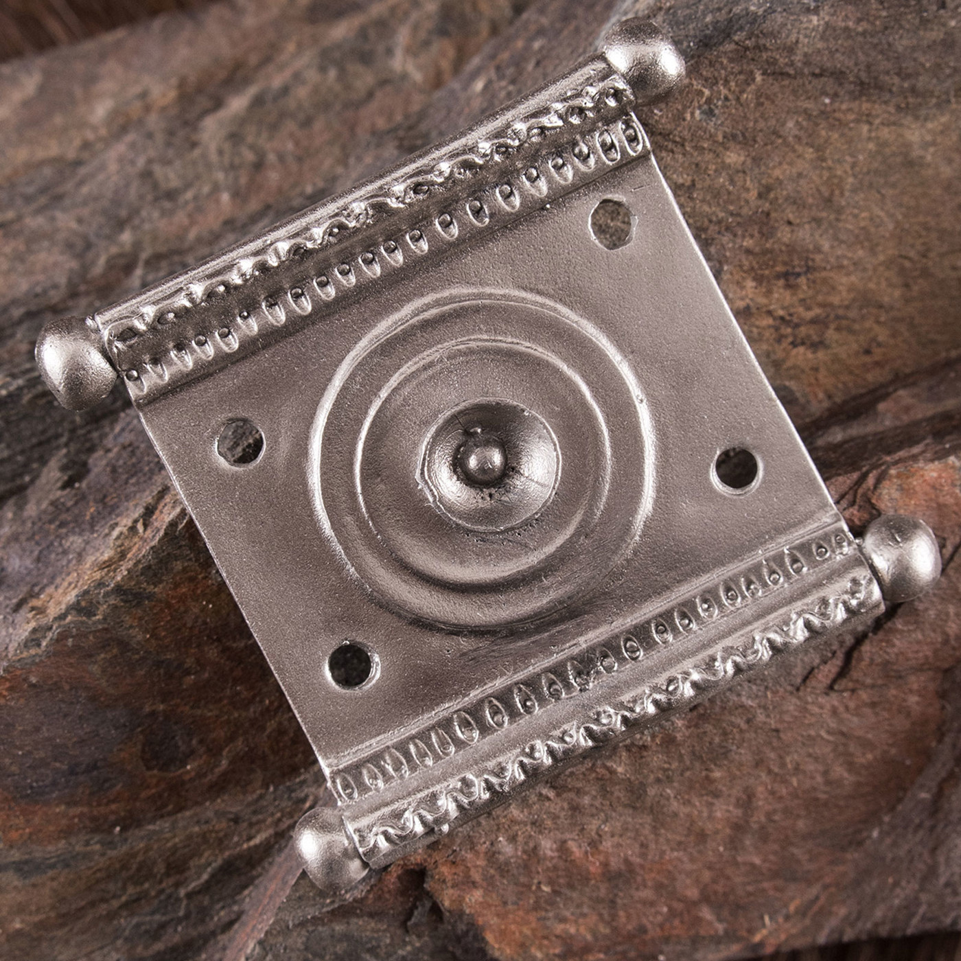 Auf der Vorderseite dominiert ein erhabenes Zierfeld mit konzentrischen Kreisen und zentralem Rundbuckel (Umbo). Zierleisten mit Perlstab und gewellten Ornamentreihen schließen oben und unten ab; markante Kugel-Endungen an den Querleisten greifen typische Formen römischer Metallarbeiten auf. Vier vorgestanzte Nietenlöcher erleichtern die schnelle, sichere Montage am Leder.