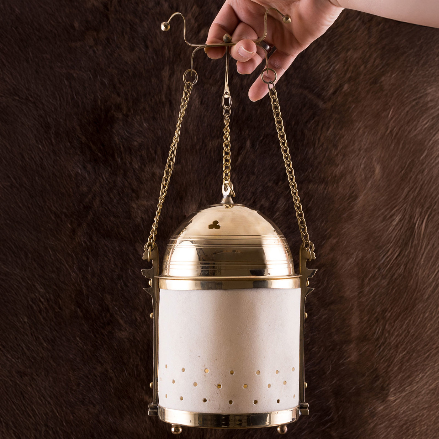 Der zylindrische Korpus ruht stabil auf drei kleinen Füßen und besteht vollständig aus massivem Messing, das auf den Produktbildern seine warme, goldene Patina zeigt. Zwei vertikale Streben verbinden Boden und oberen Ring und tragen den kuppelförmigen Deckel, der mit dekorativen Lüftungsöffnungen versehen ist. Diese sorgen für Sauerstoffzufuhr und verleihen der Laterne ihr unverwechselbares antikes Erscheinungsbild.