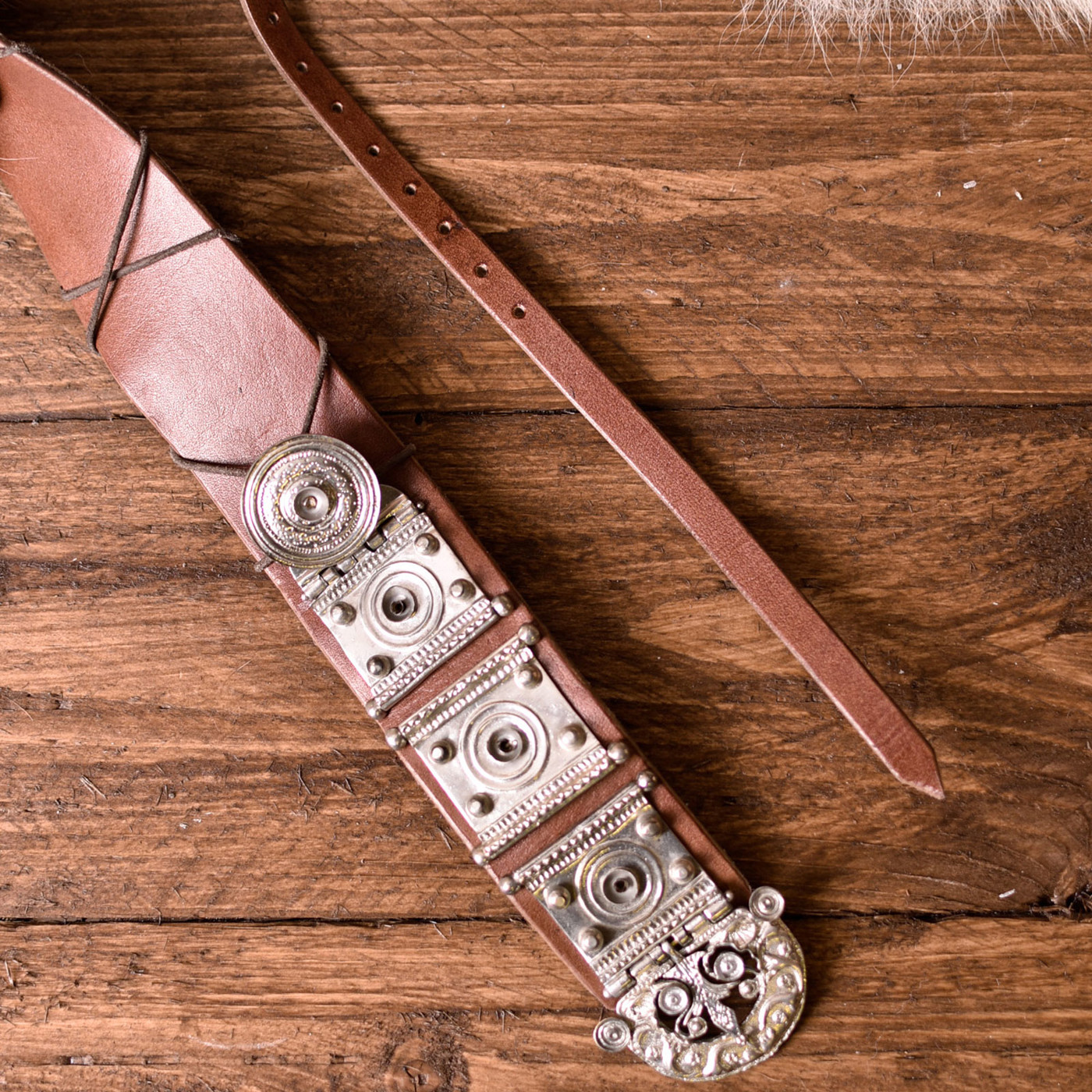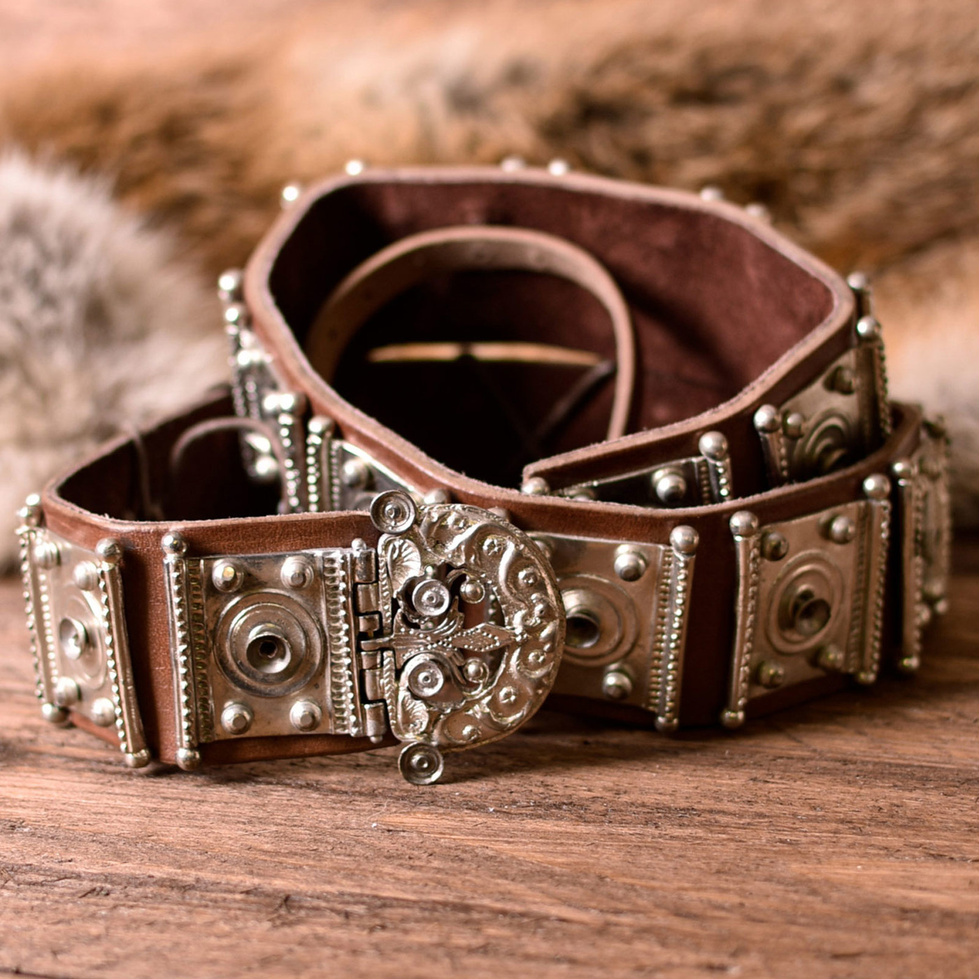 Authentischer Wikingergürtel aus Leder mit detailreicher Messingschnalle im Sutton-Hoo-Stil. Inspiriert vom berühmten angelsächsischen Fund des 7. Jahrhunderts…