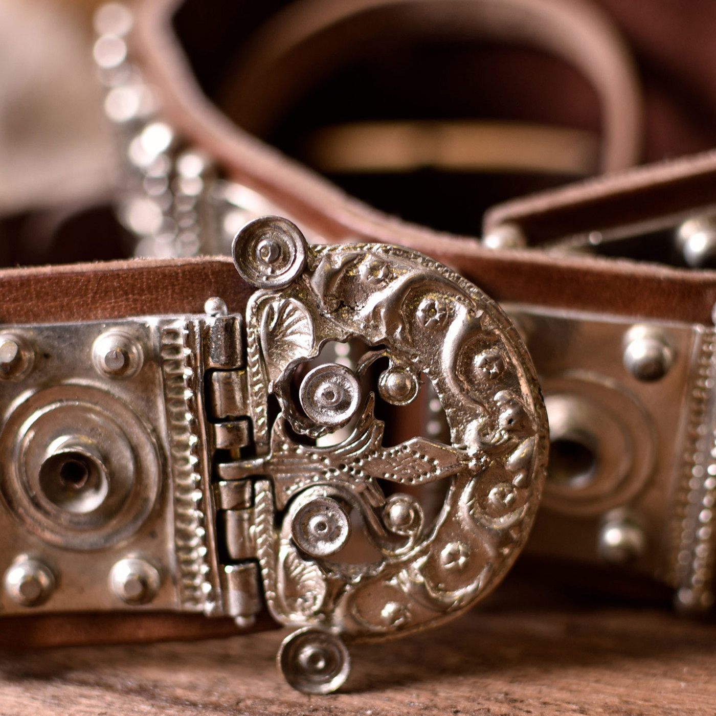 Hinsichtlich der Materialien wurde Rindsleder von höchster Qualität für den Gürtel verwendet, um eine optimale Haltbarkeit und Komfort zu gewährleisten. Die Beschläge bestehen aus verzinntem Messing und verleihen dem Gürtel einen einzigartigen Glanz.