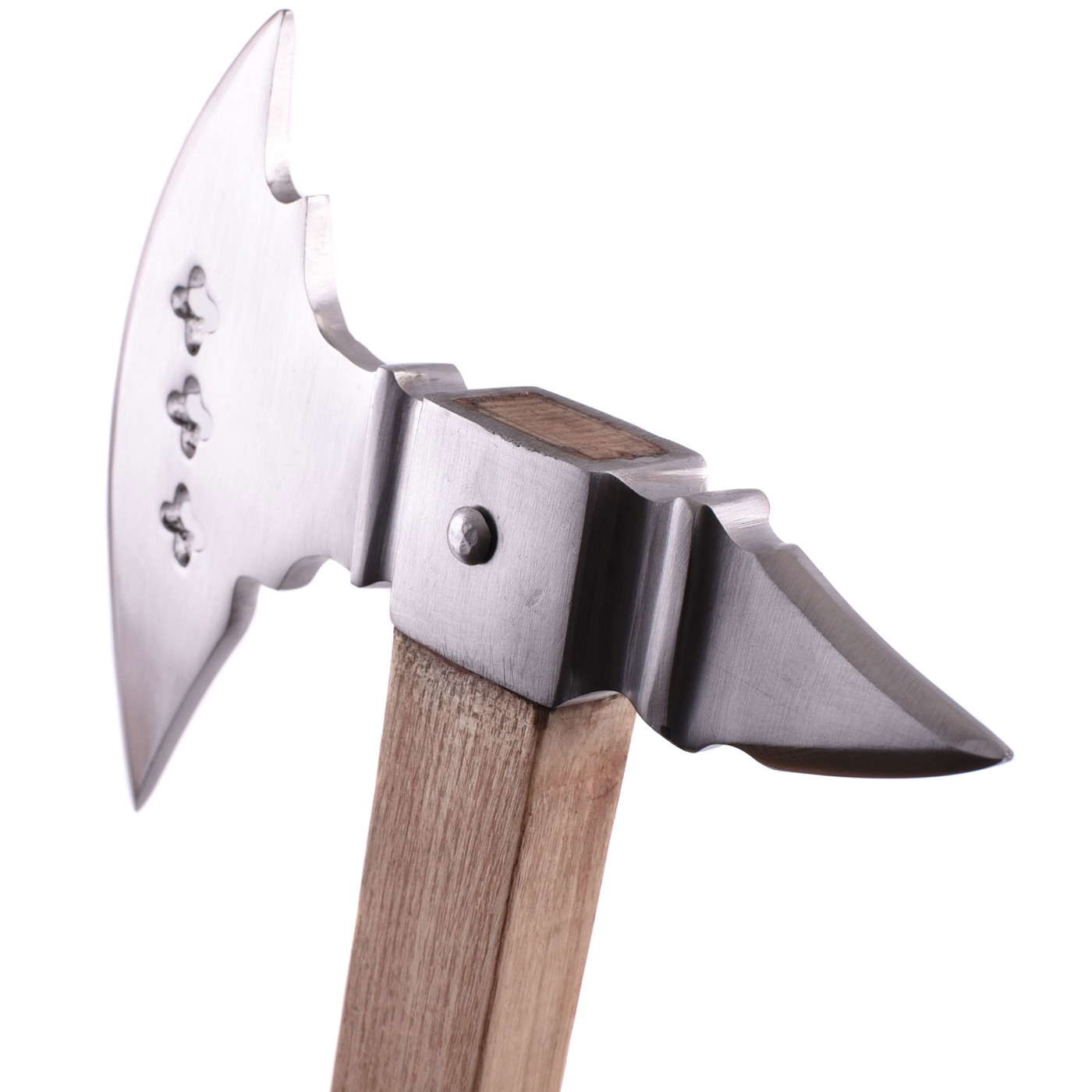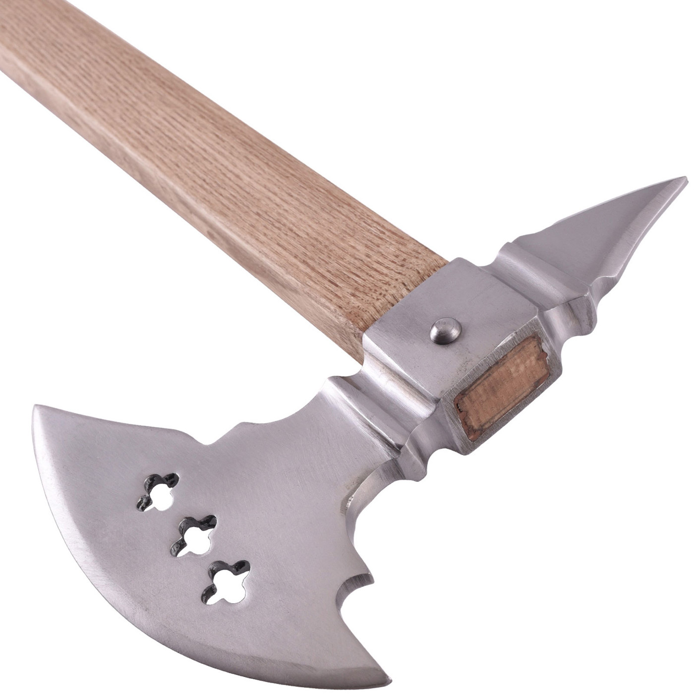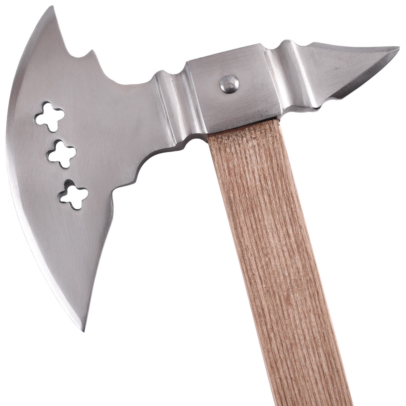Ihr markantes Axtblatt aus poliertem Stahl mit kunstvollen Kleeblatt-Aussparungen verleiht der Axt eine unverwechselbare Optik, während der massive Holzstiel für Stabilität und authentisches Handling sorgt. Die Kombination aus Schärfe, Eleganz und Stabilität macht sie zu einem echten Highlight für Sammler, Reenactors und Mittelalter-Enthusiasten.