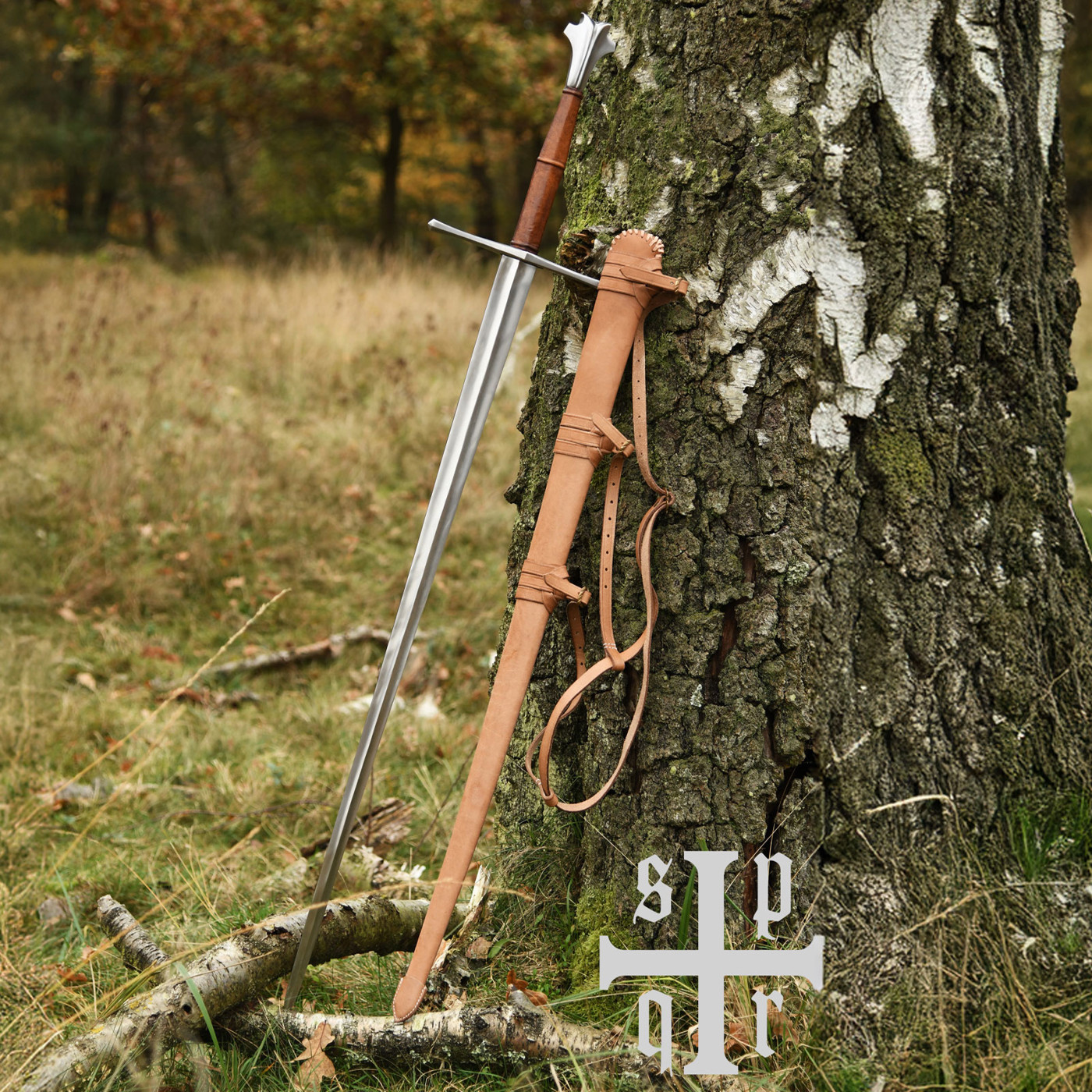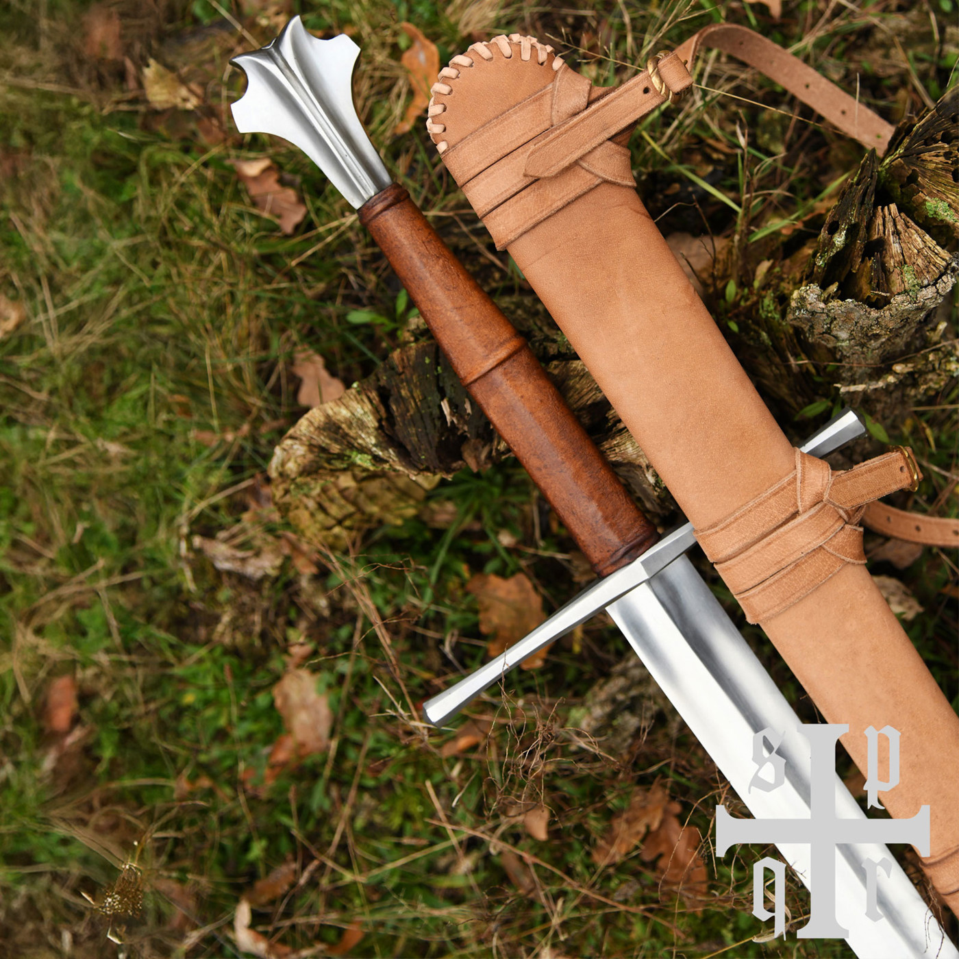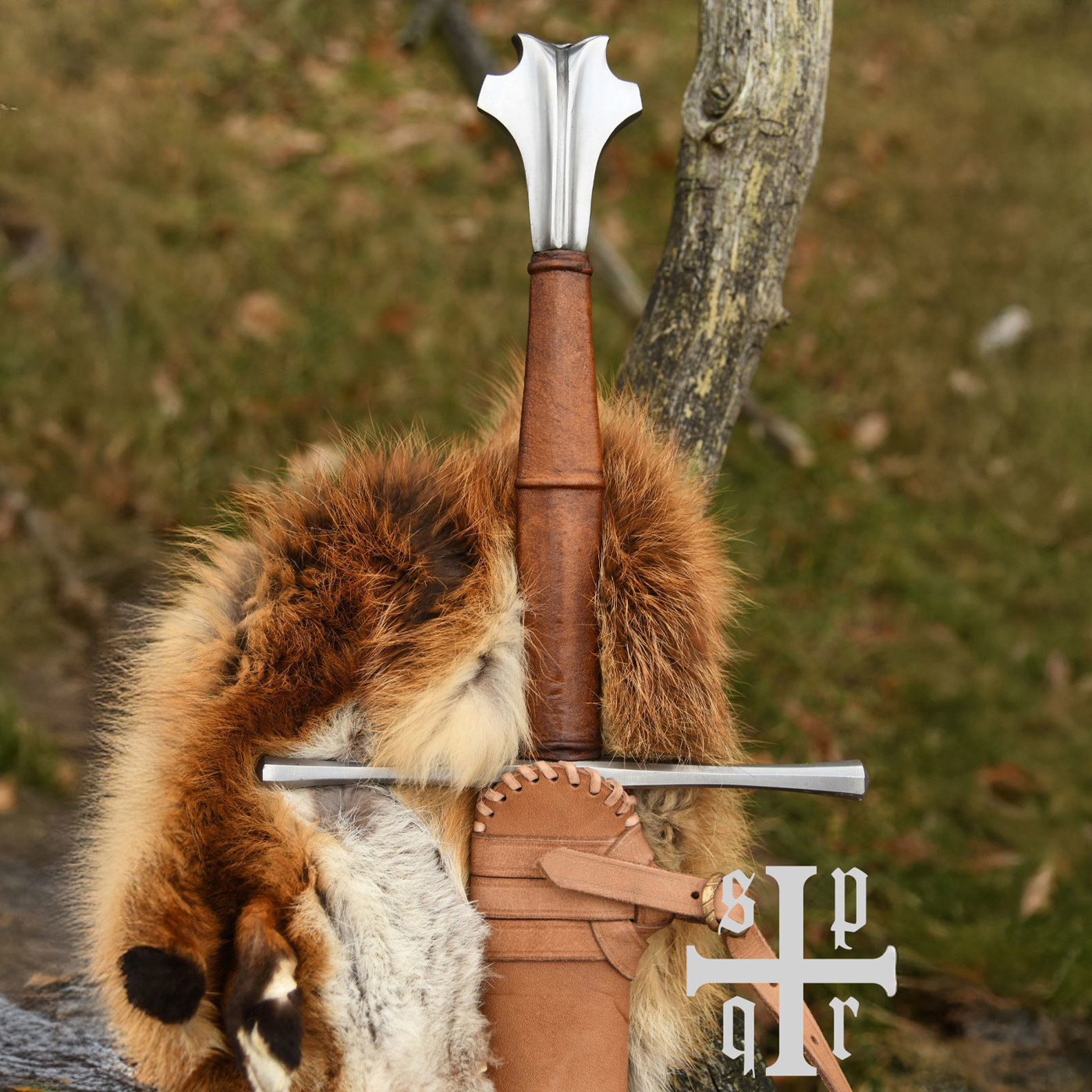 In den Händen eines erfahrenen Schwertkämpfers wird diese Waffe zu mehr als Stahl und Leder – sie wird zur Verlängerung des Willens. Die klar geschmiedete Federstahlklinge, der markante Fischschwanzknauf und die kunstvoll gearbeitete Lederscheide mit authentischem Tragesystem verleihen diesem Stück historische Seele und moderne Funktionalität.