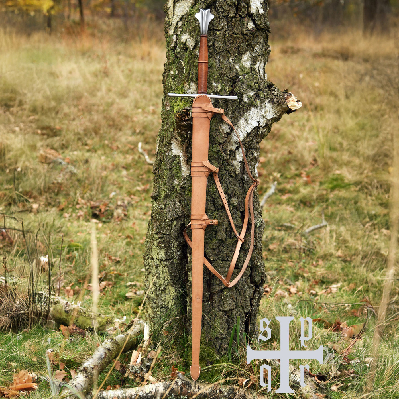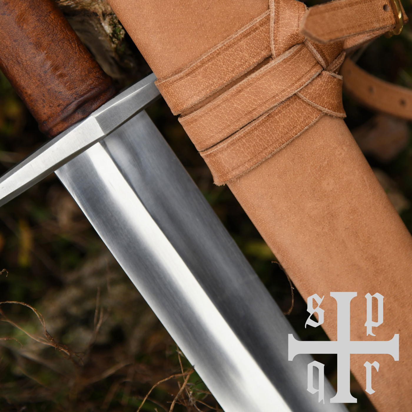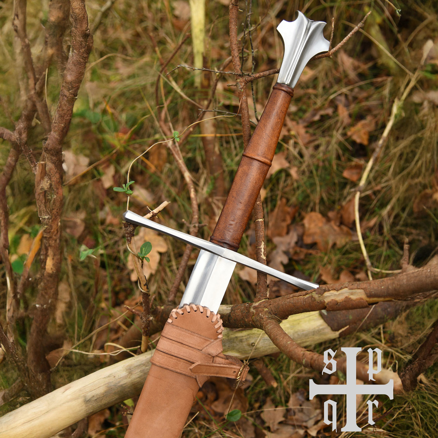 In den Händen eines erfahrenen Schwertkämpfers wird diese Waffe zu mehr als Stahl und Leder – sie wird zur Verlängerung des Willens. Die klar geschmiedete Federstahlklinge, der markante Fischschwanzknauf und die kunstvoll gearbeitete Lederscheide mit authentischem Tragesystem verleihen diesem Stück historische Seele und moderne Funktionalität.