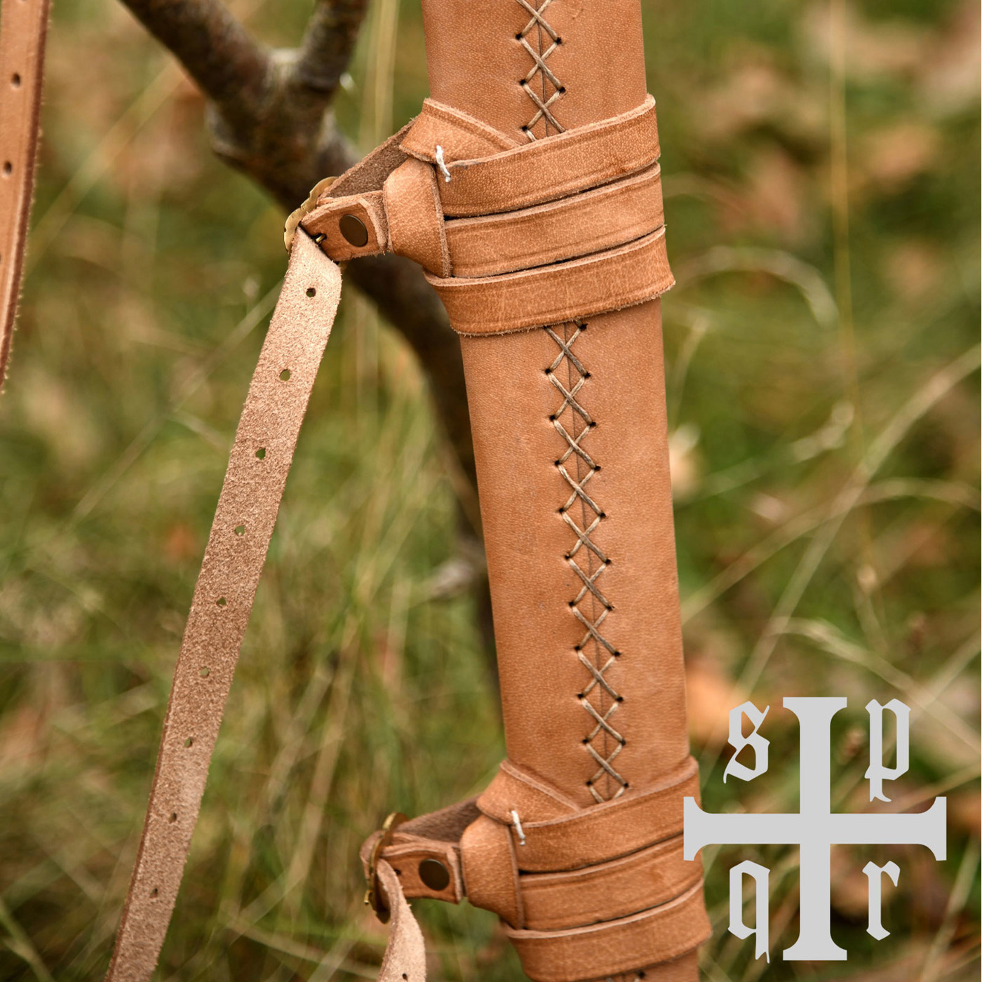 Die Lederscheide besteht aus vegetabil gegerbtem Naturleder und wird inklusive eines authentischen Tragesystems mit Messingschnallen geliefert.