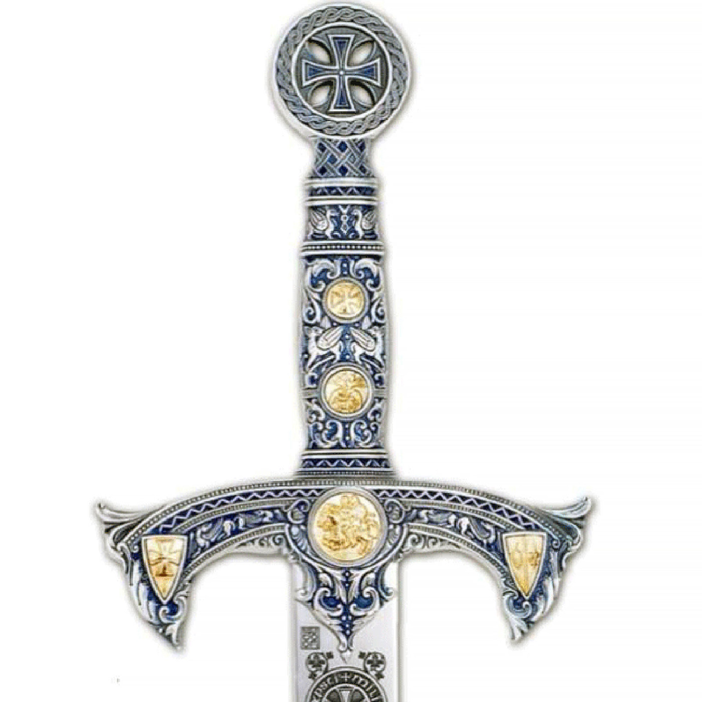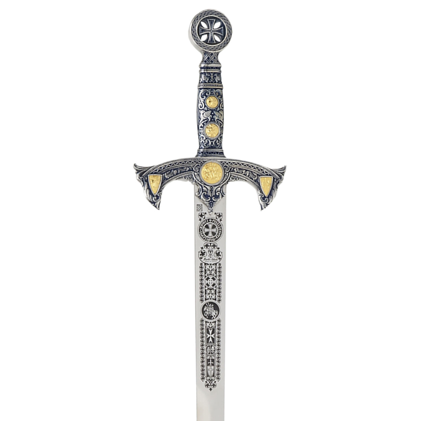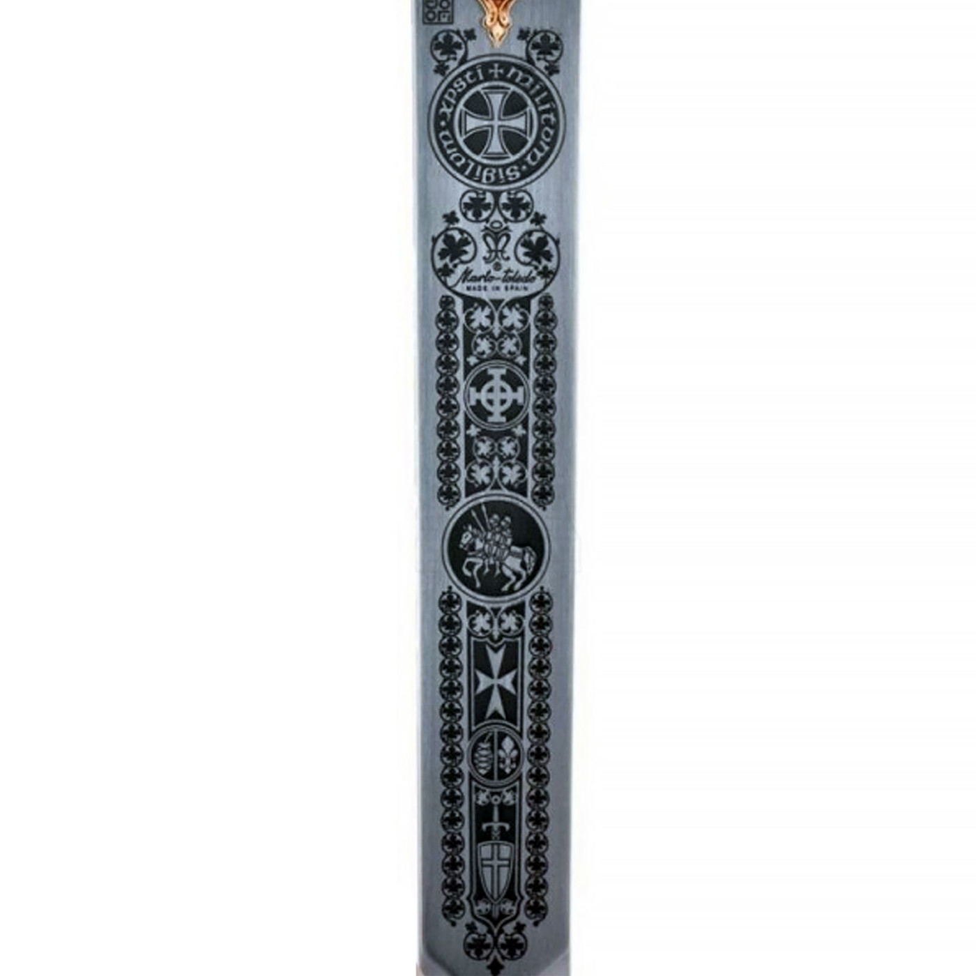 Unsere Version des Templerschwertes wird von der beeindruckenden blau-silbernen Farbgebung und den kunstvollen Zierätzungen veredelt. Ein wahres Kunstwerk, das den Geist und die Pracht des Ordens verkörpert. Das beigefügte Zertifikat garantiert die Echtheit und Herkunft des Schwertes und unterstreicht die Bedeutung von "Hecho en Toledo" - einem Siegel, das für Qualität und Tradition steht.