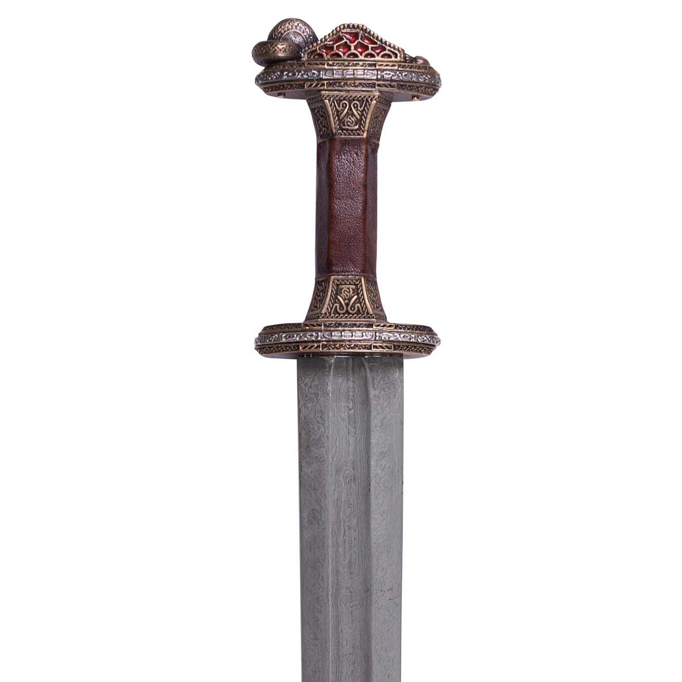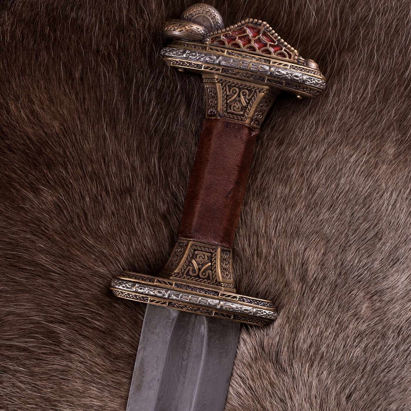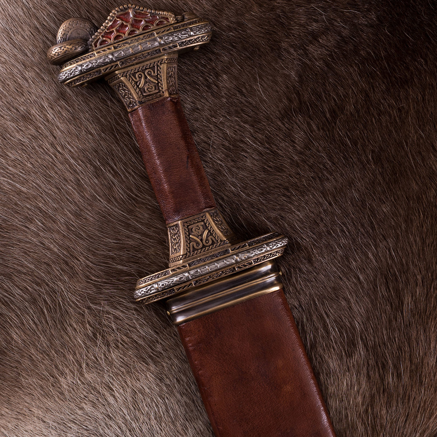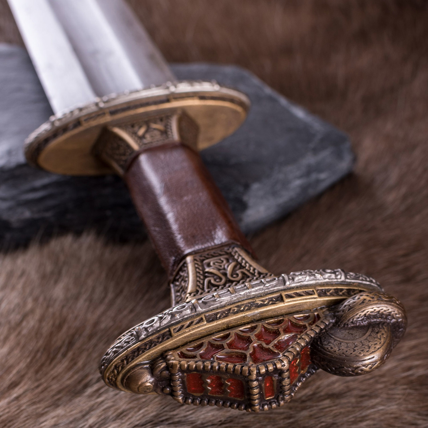 Schon beim ersten Blick offenbart sich die außergewöhnliche Detailtiefe: Das reich verzierte Messingheft mit Antik-Finish ist kunstvoll graviert und erinnert an die aufwendig gearbeiteten Originalfunde der Vendelzeit. Besonders auffällig ist der mehrteilige Knauf mit seinen filigranen Ornamenten und der roten Emaille-Einlage, die an edle Granate erinnert – ein Symbol für Macht und Reichtum.