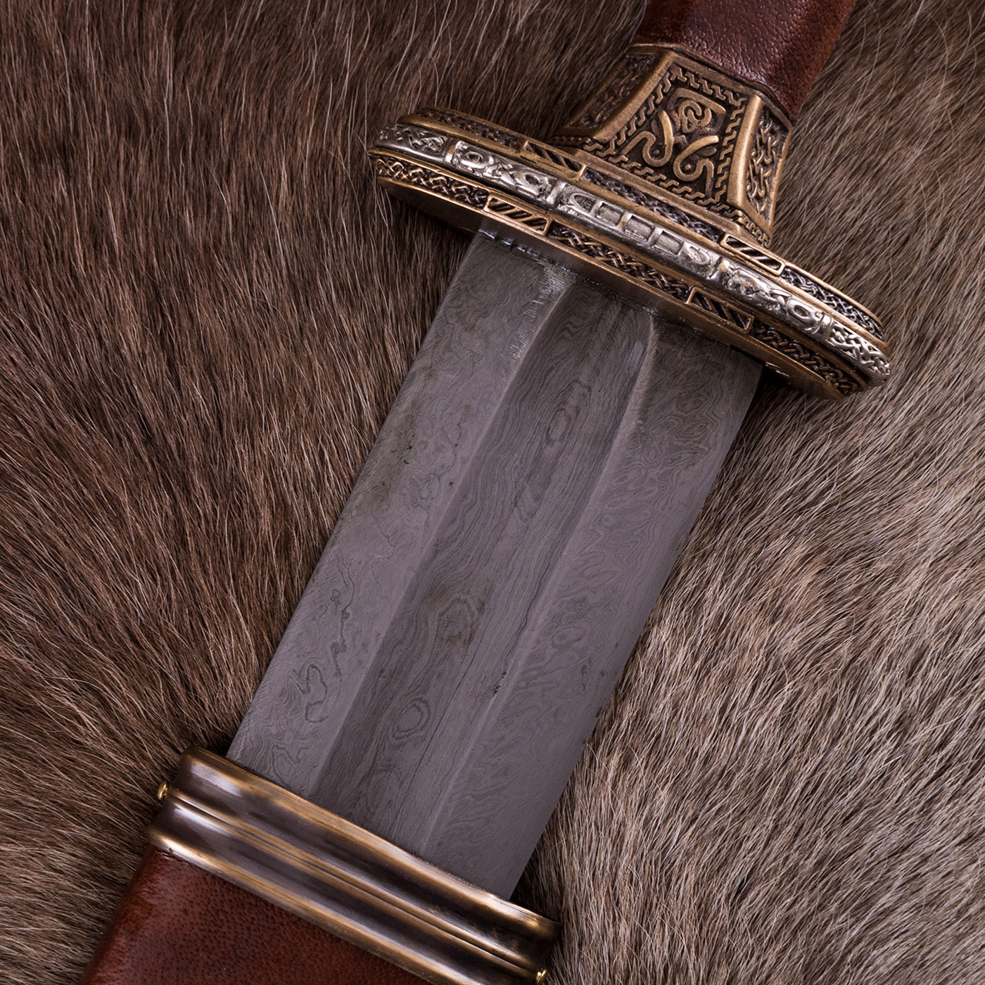 Vendelzeit-Schwert mit Damastklinge & verzierter Scheide – Skandinavischer Einhänder mit Messingheft