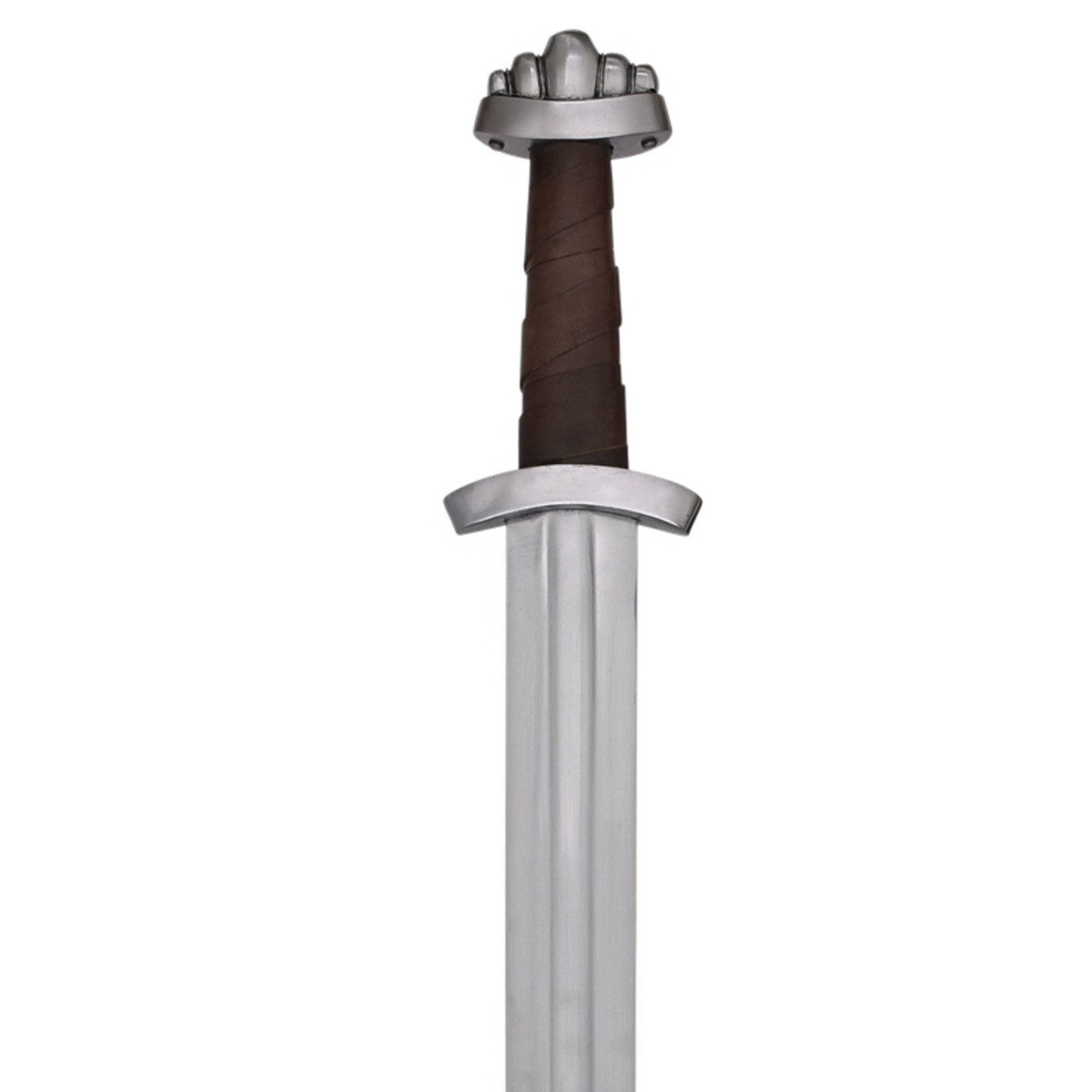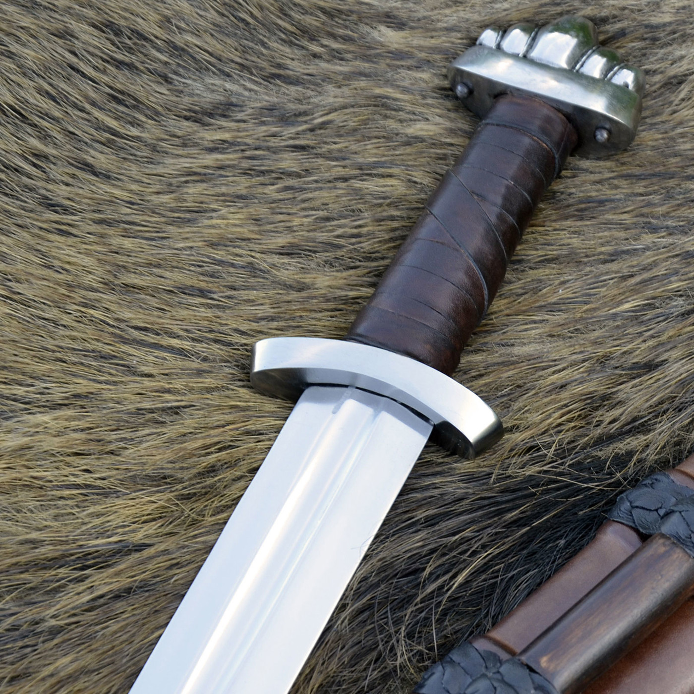 Die lange, schlanke Klinge mit markanter Hohlkehle, der typische fünfwulstige Knauf aus Stahl und die lederumwickelte Griffpartie spiegeln die klare, funktionale Ästhetik frühmittelalterlicher Waffenschmiedekunst wider. Keine überflüssigen Verzierungen – sondern kompromisslose Zweckmäßigkeit, wie sie die Wikinger schätzten.