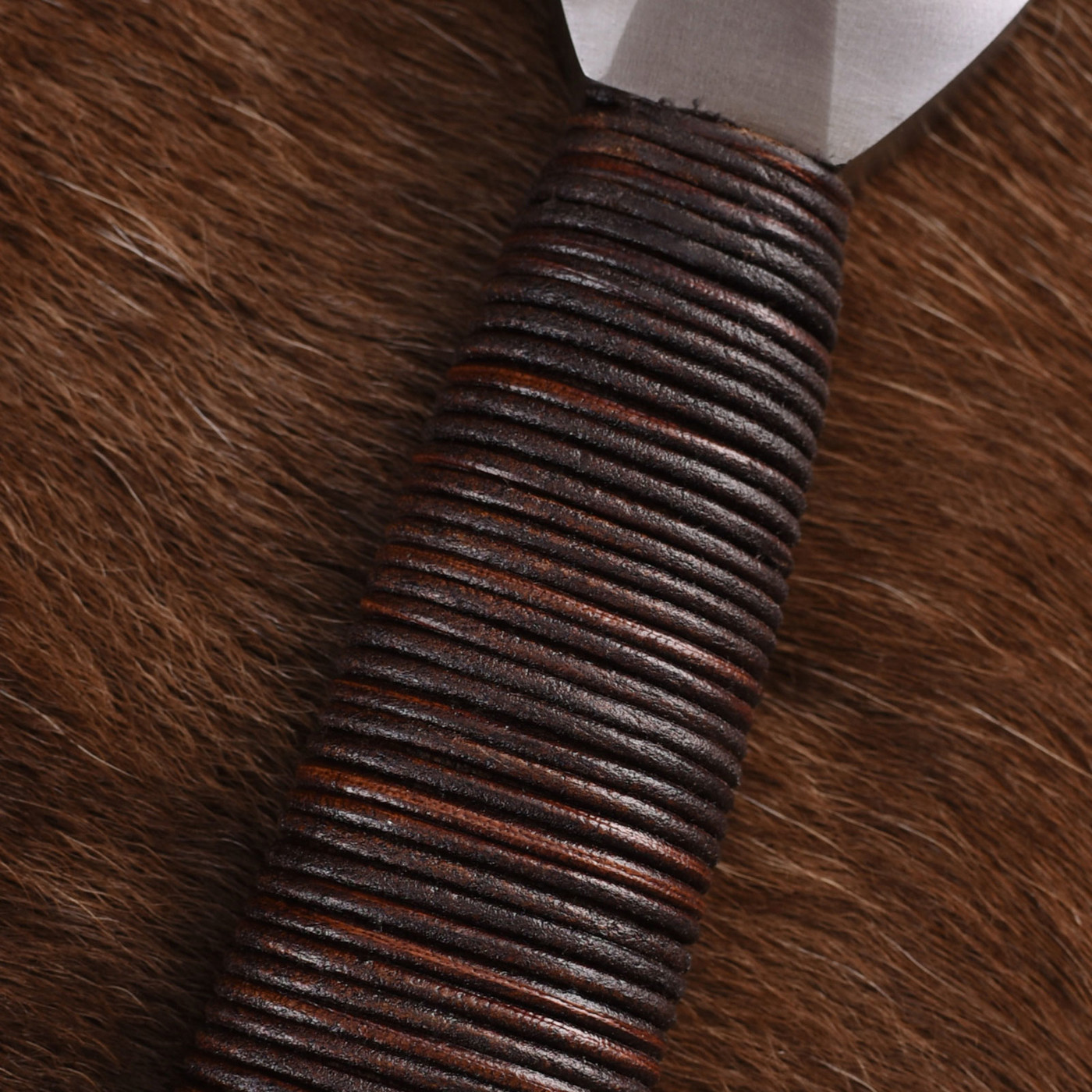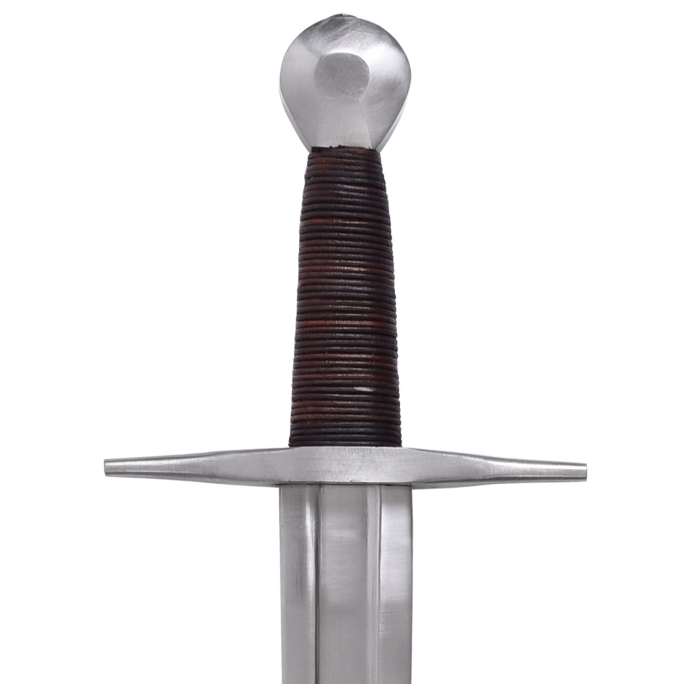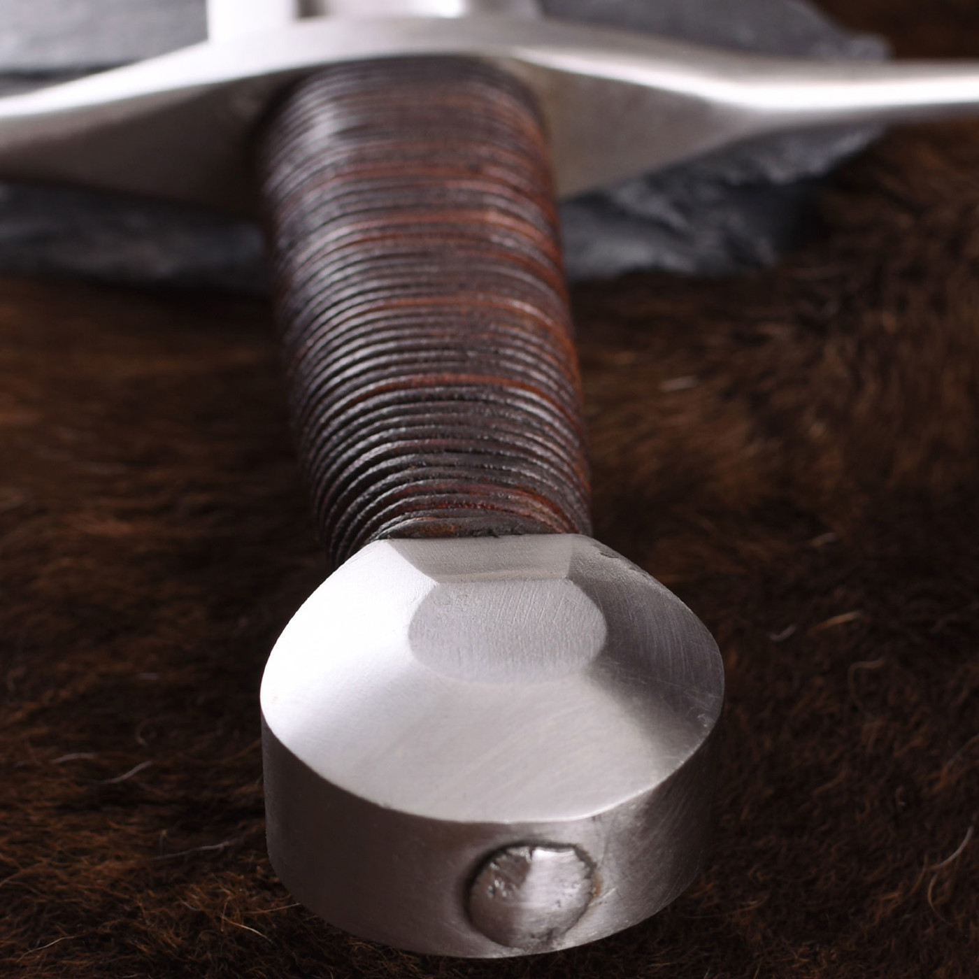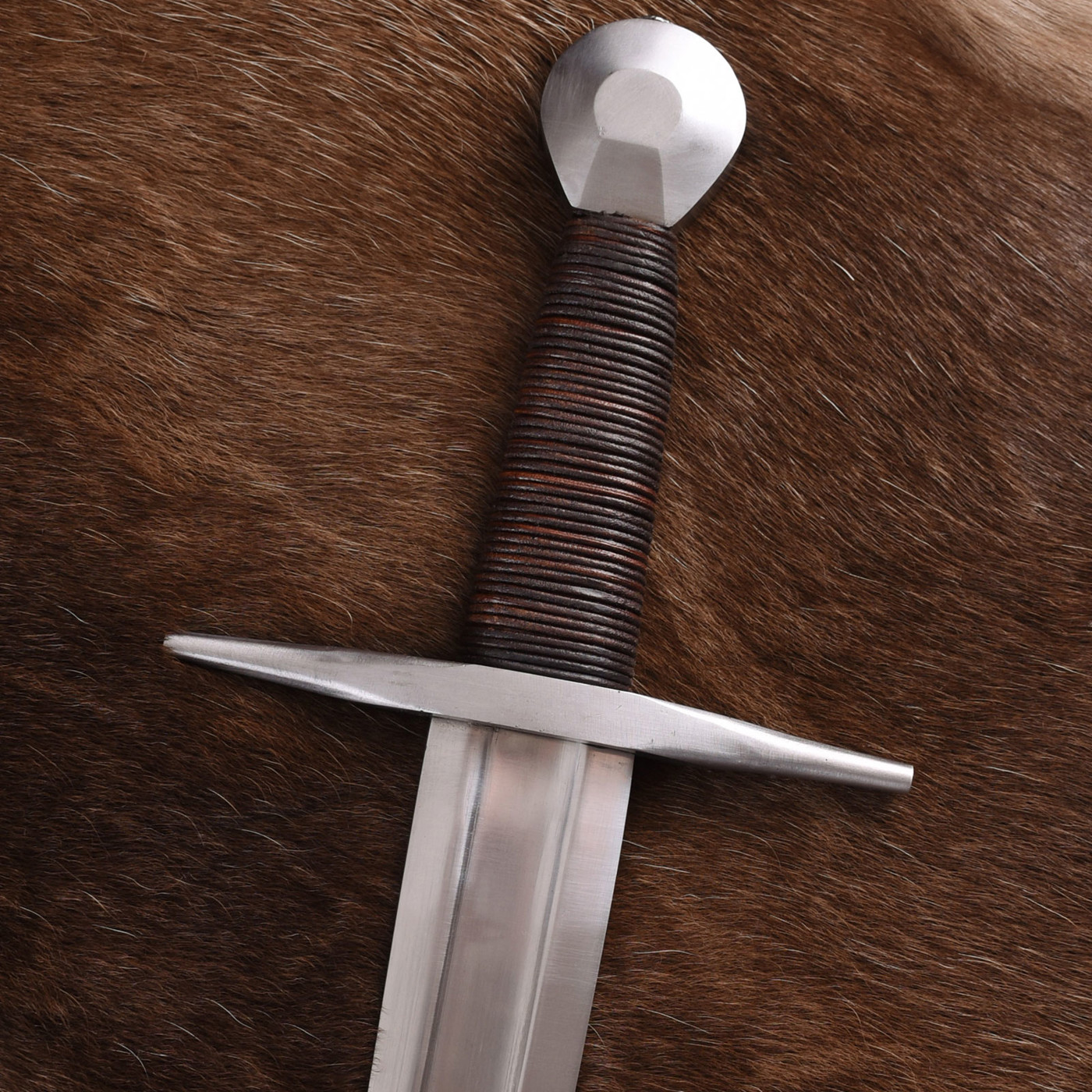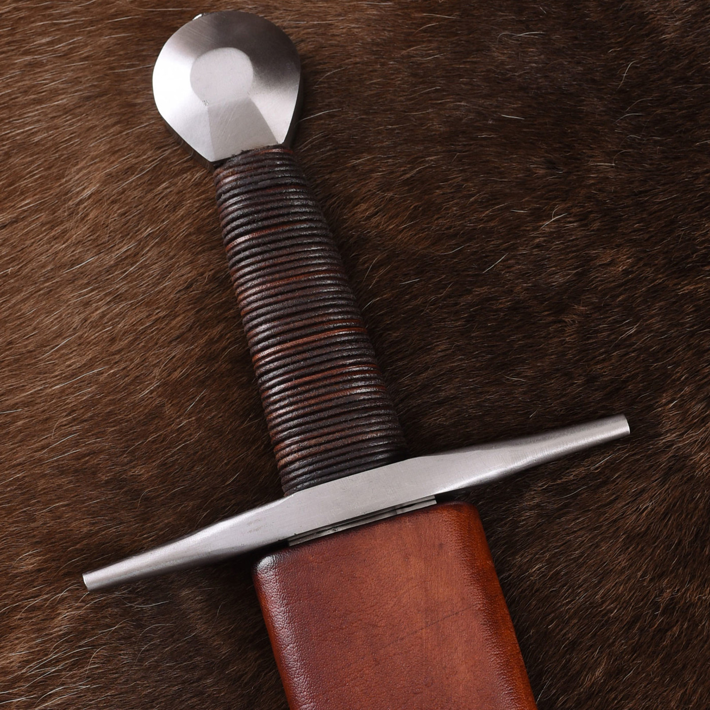 Die klare, funktionale Form und das schlichte, kraftvolle Design zeigen den Übergang vom Wikinger- zum mittelalterlichen Ritterschwert – eine Zeit, in der aus freien Kriegern die ersten Ritter wurden. Wenn du dieses Schwert in der Hand hältst, spürst du sofort seine perfekte Balance, die solide Klinge und den festen Halt des lederumwickelten Griffs – ein Gefühl, das Geschichte greifbar macht.