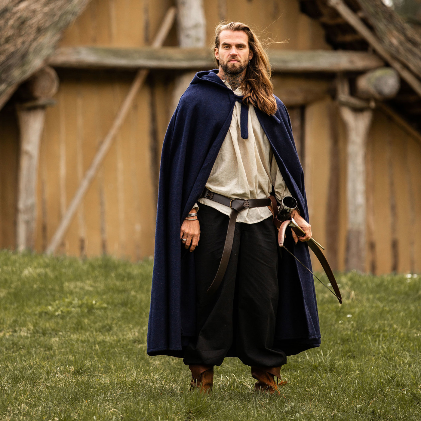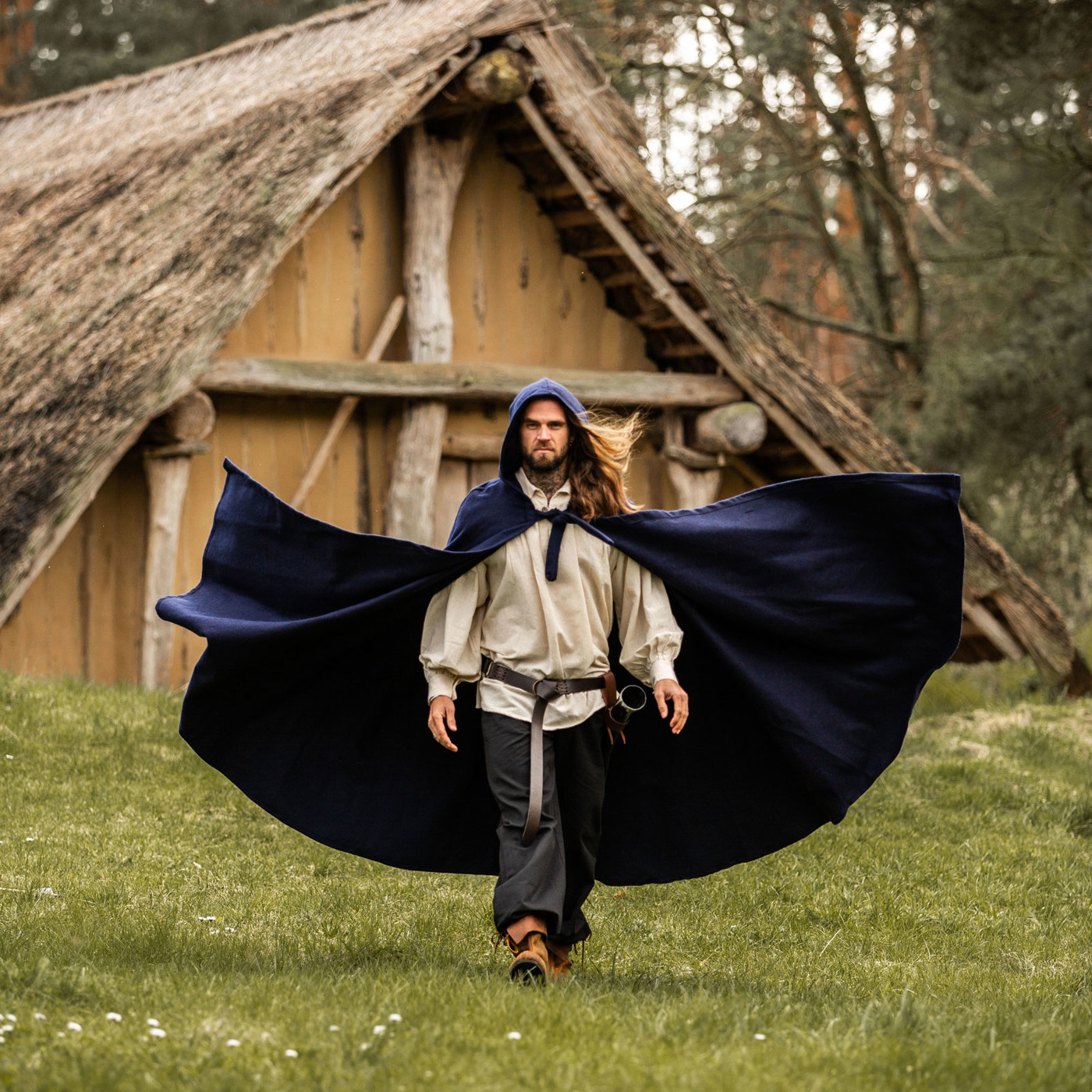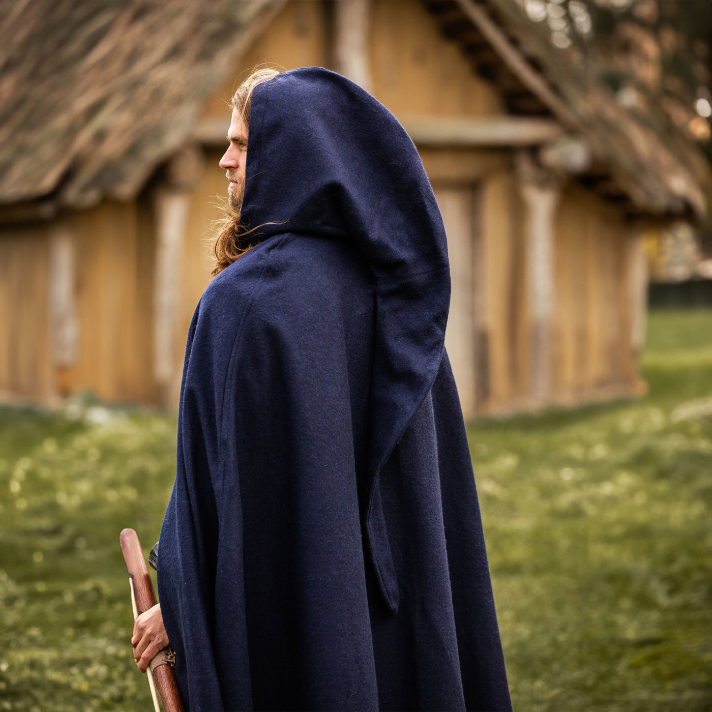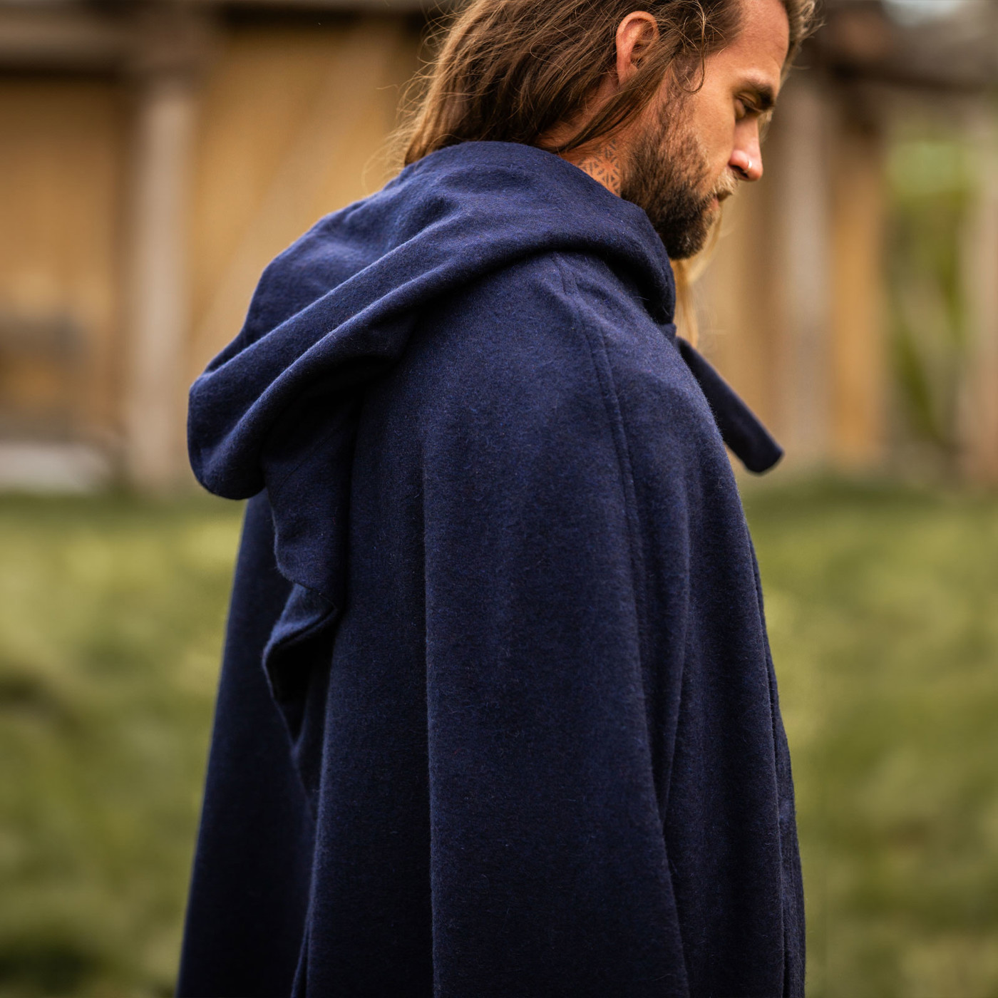 Stell dir vor, du schreitest durch ein altes Wikingerdorf. Der Wind peitscht dir entgegen, doch dein Wollumhang „Hervir“ legt sich schützend um deine Schultern. Die lange Kapuze wirft Schatten über dein Gesicht und verleiht dir ein geheimnisvolles Auftreten. Am Lagerfeuer wärmt dich der schwere Wollstoff, während du mit Gefährten Geschichten vergangener Schlachten teilst.