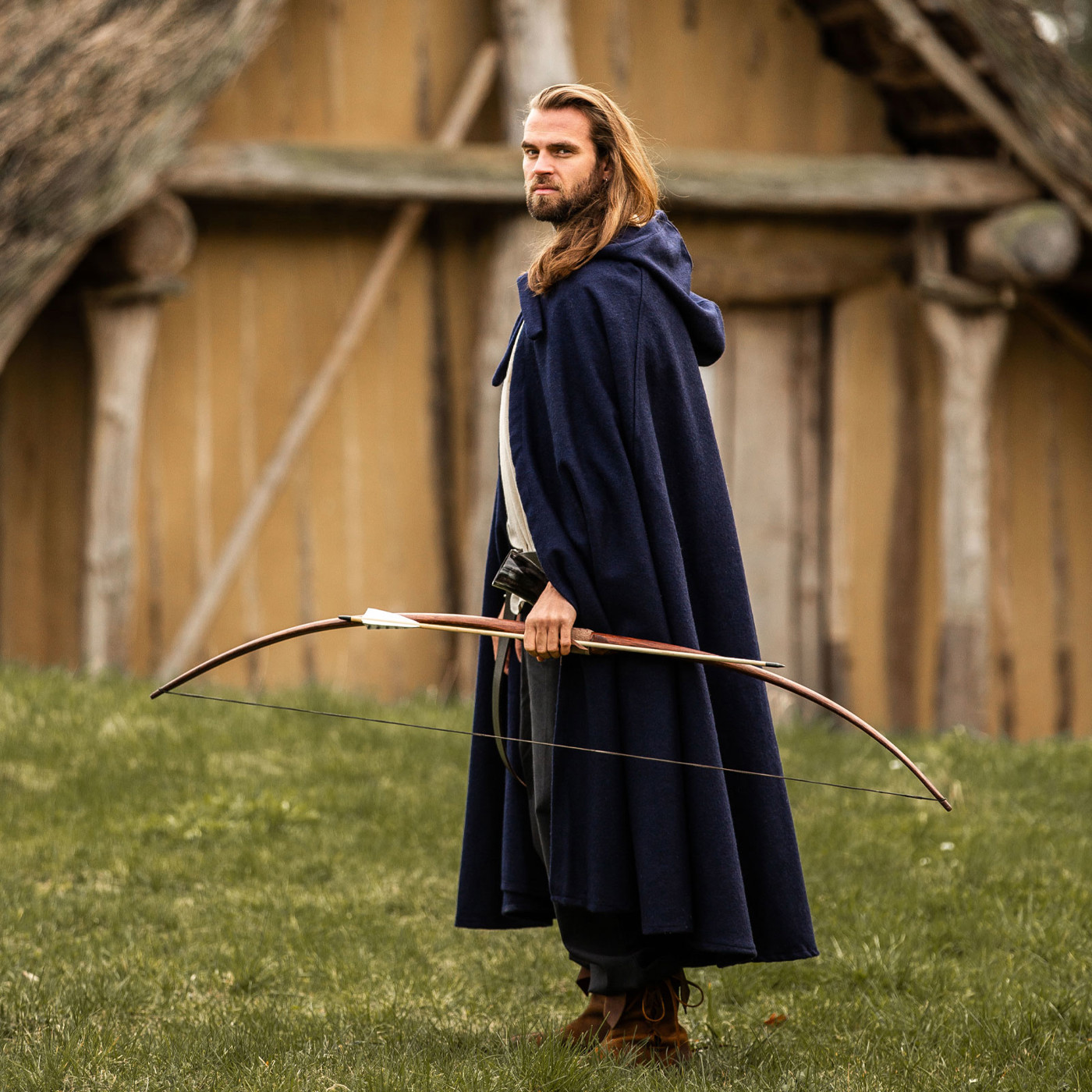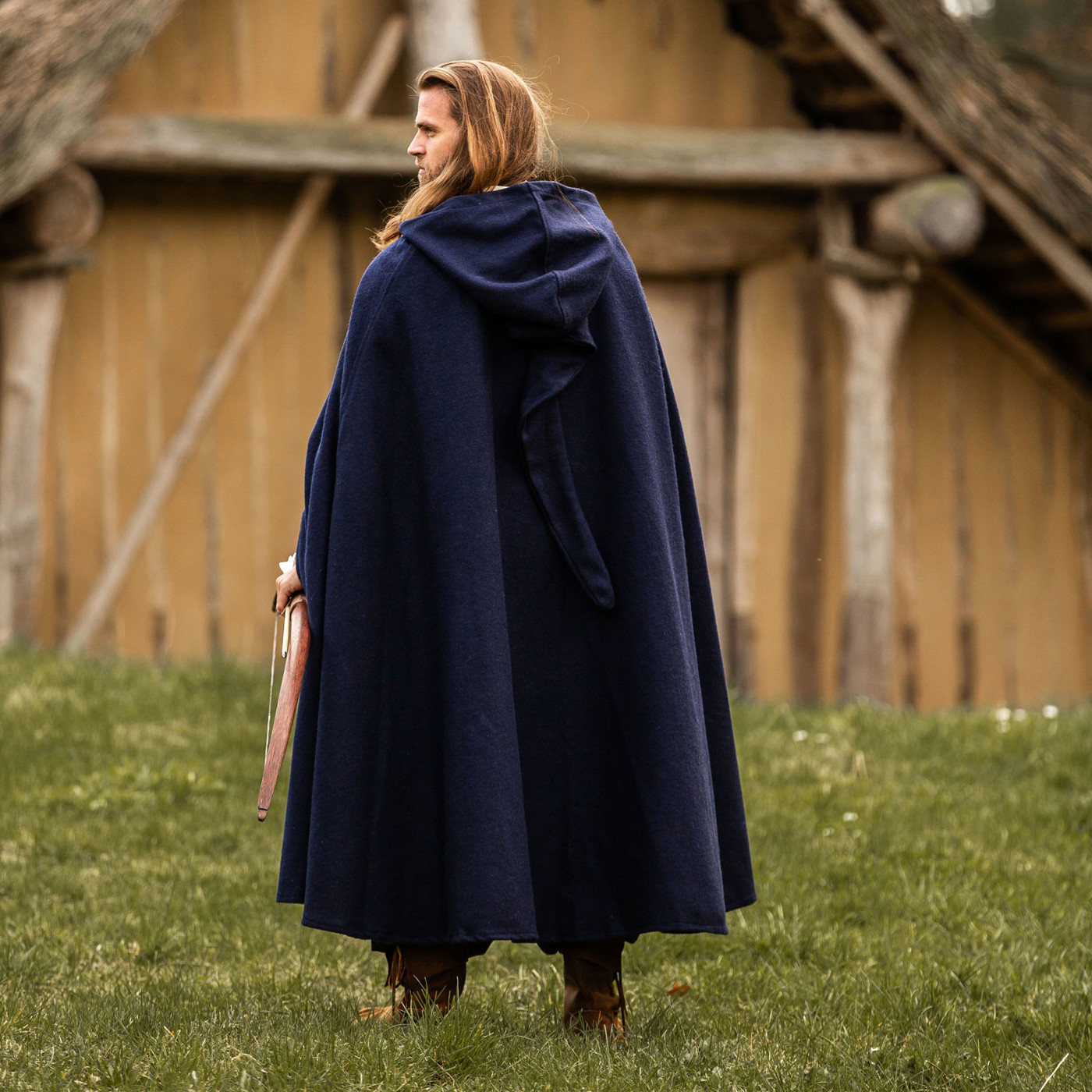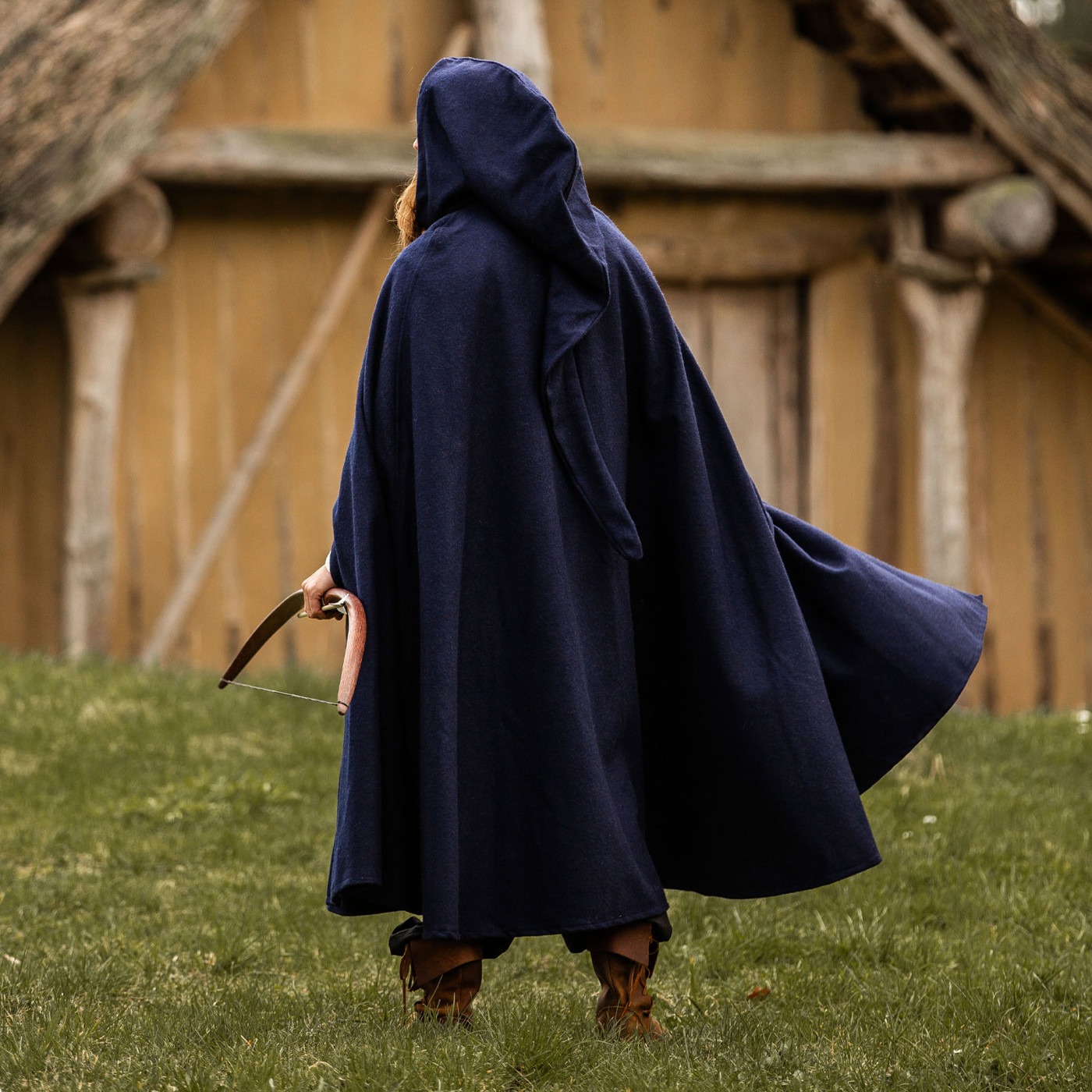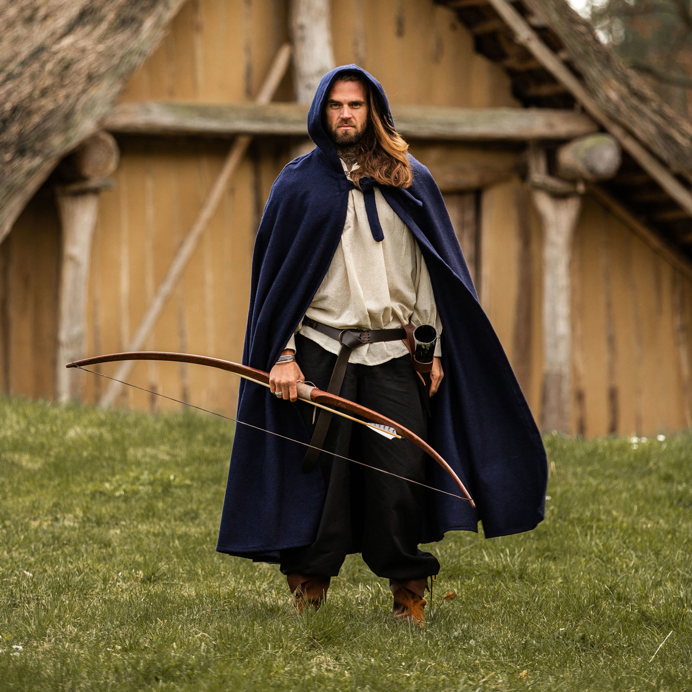 Stell dir vor, du schreitest durch ein altes Wikingerdorf. Der Wind peitscht dir entgegen, doch dein Wollumhang „Hervir“ legt sich schützend um deine Schultern. Die lange Kapuze wirft Schatten über dein Gesicht und verleiht dir ein geheimnisvolles Auftreten. Am Lagerfeuer wärmt dich der schwere Wollstoff, während du mit Gefährten Geschichten vergangener Schlachten teilst.
