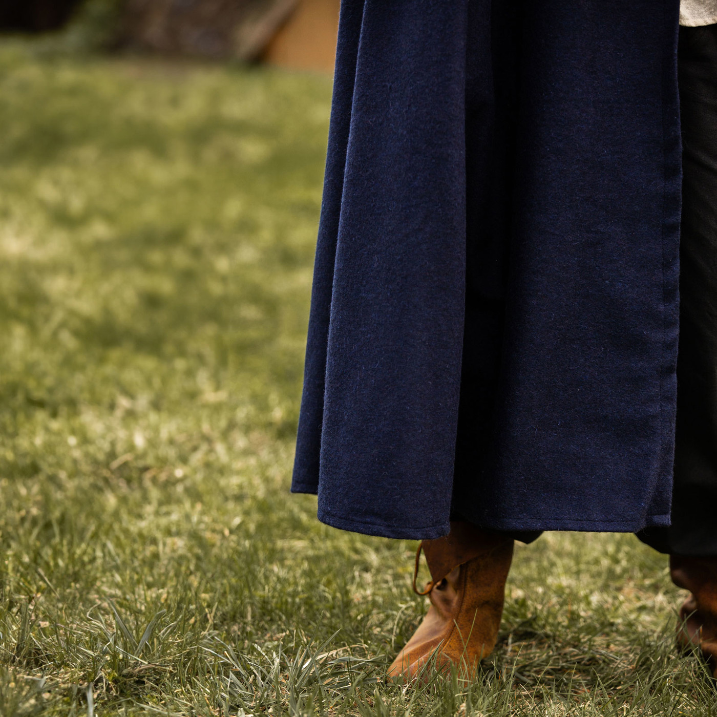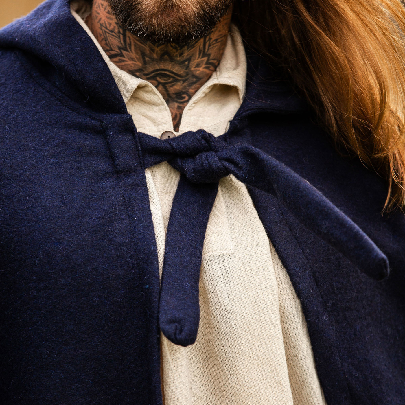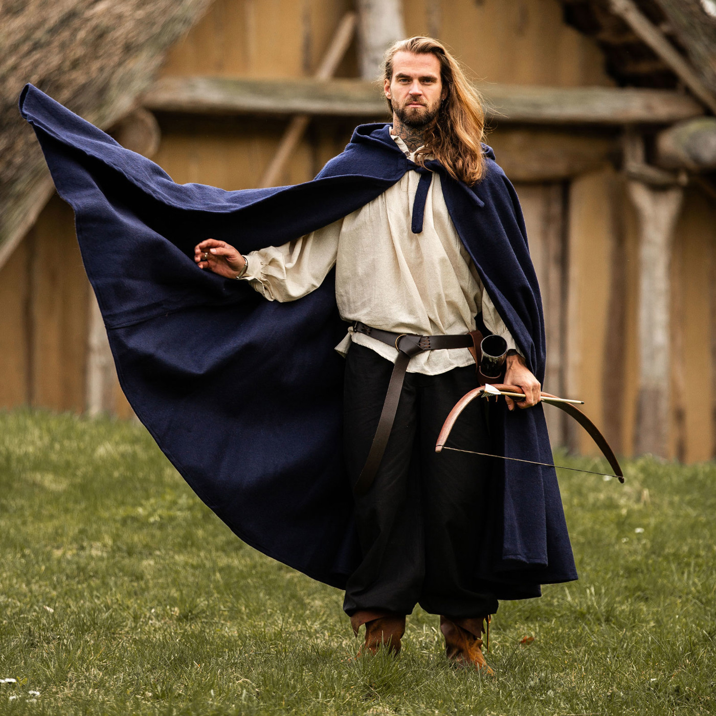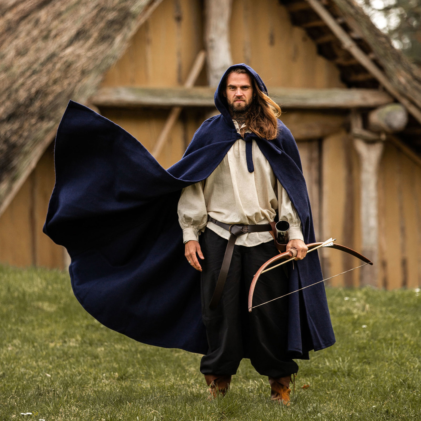 Der Umhang wird klassisch mit Kordeln gebunden, was sicheren Halt garantiert und zugleich den historischen Charakter unterstreicht. Dank seines schweren Wollgemischs ist er wärmend, robust und bei leichtem Regen wasserabweisend – ideal für Outdoor-Abenteuer, LARP-Schlachten oder nächtliche Lagerfeuer.